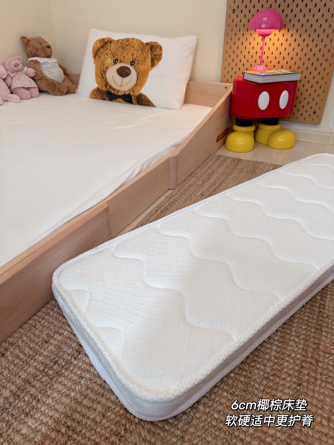 这张床一些小细节也做的很到位,床板以及外框都很有质感滑溜溜的没有毛刺,四周边边角角也都是圆角设计,不怕磕磕碰碰了,而且配套的椰棕床垫,软硬适中也很护脊