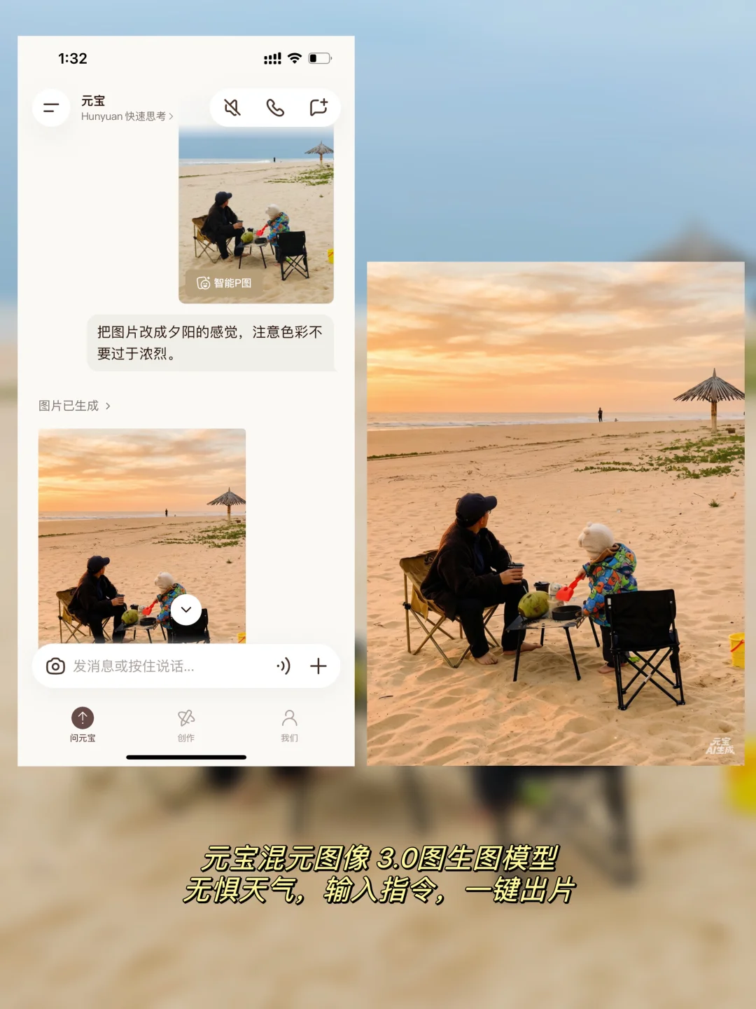 海边拍照天气不好,我用元宝的混元3.0图生图模型,AI P图瞬间把灰蒙蒙的天变成清新的漫画蓝天☁️