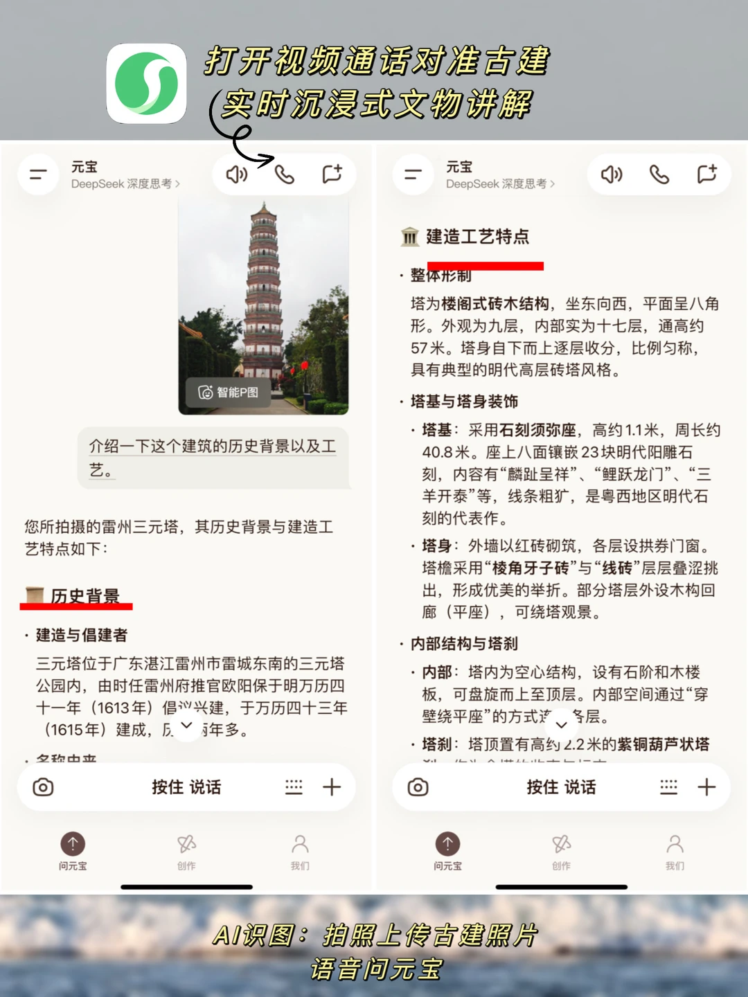 在“南海一号”博物馆,娃对着沉船问个不停。我打开元宝的AI识图,拍个文物,它立刻用孩子能听懂的语言讲解背景。打开视频,实时景点讲解,娃听得超入迷,老婆连夸:“这可比租讲解器好用多了!”