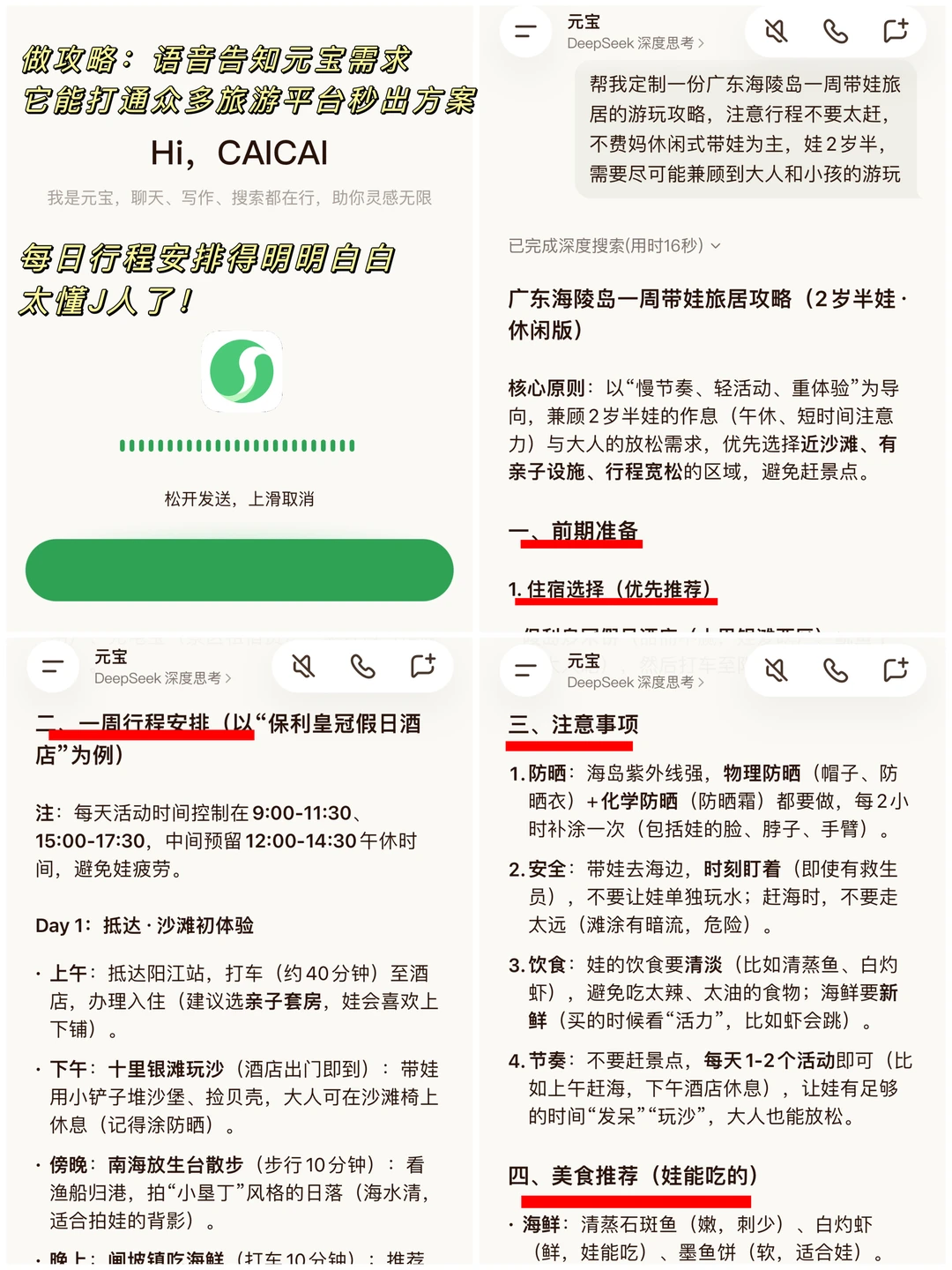 以前做攻略,要在各个APP间反复横跳。这次,我直接对元宝说:“帮我规划一个一周的海陵岛亲子行程,孩子2岁,要轻松、有特色体验、避开人挤人。” 它秒出详细方案,连“赶海工具在瓦晒湾入口租最便宜”这种细节都想到了!还标注了最佳游玩时间,连交通和亲子酒店都帮我筛选好了,不用我熬夜刷做功课