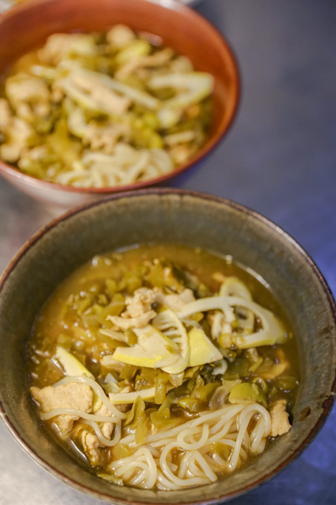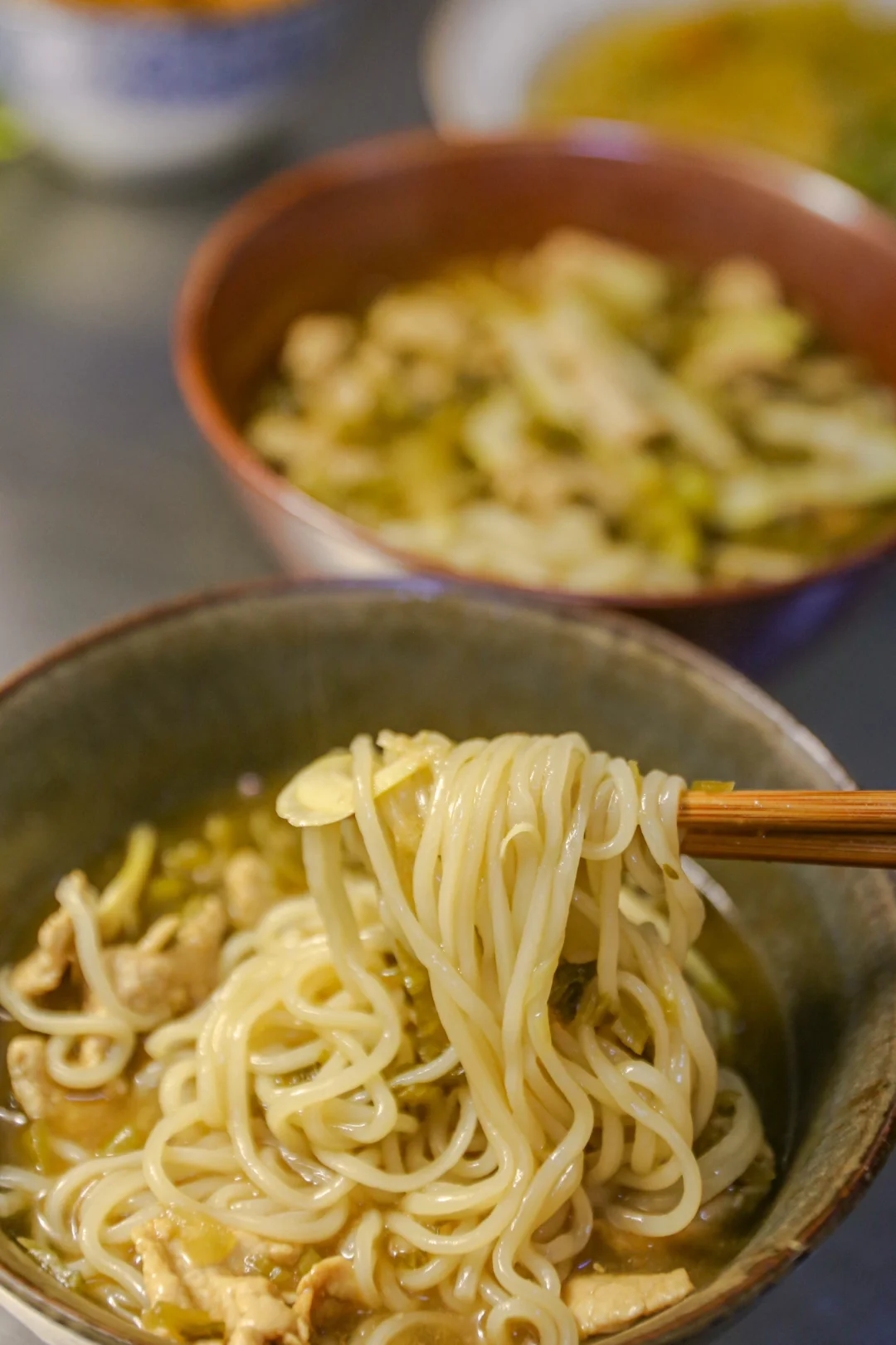 3:面条入沸水大锅中煮2分钟,用竹笊禽捞起,甩去水份,随即倒入盛有沸水原汤的锅中煮一、二分钟,加入食盐、味精,淋上熟猪油(10克),即可起锅装碗,盖上雪菜肉片浇头即成。