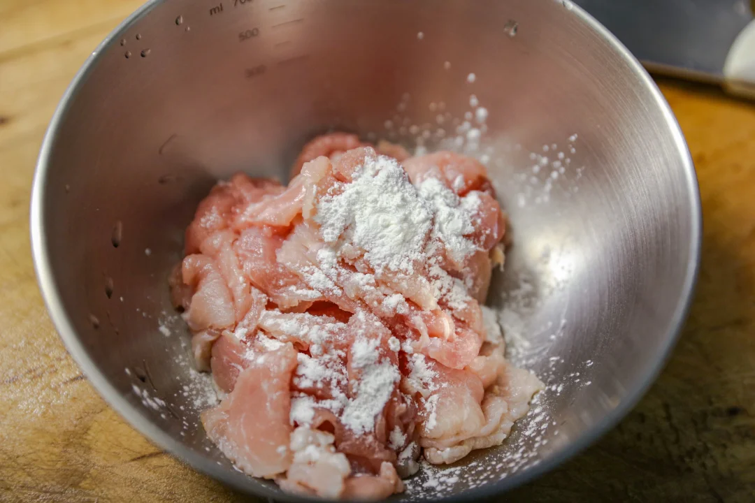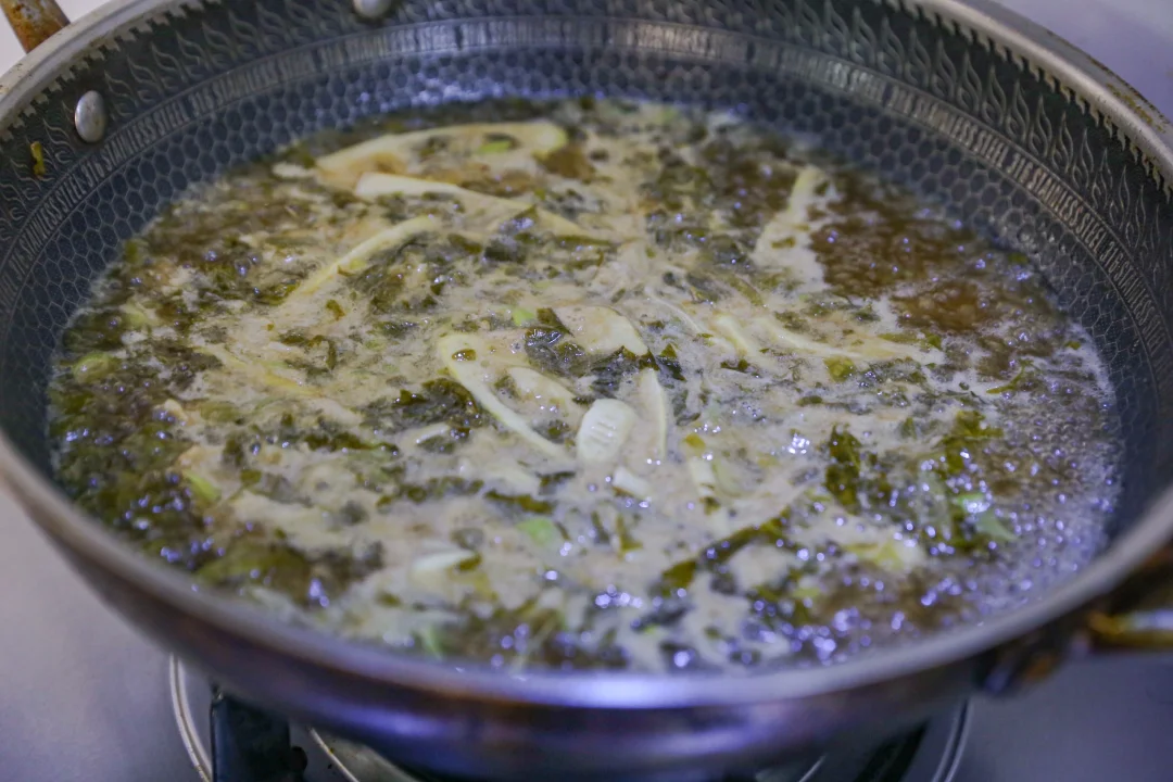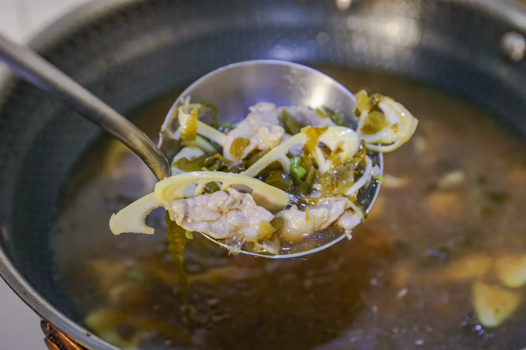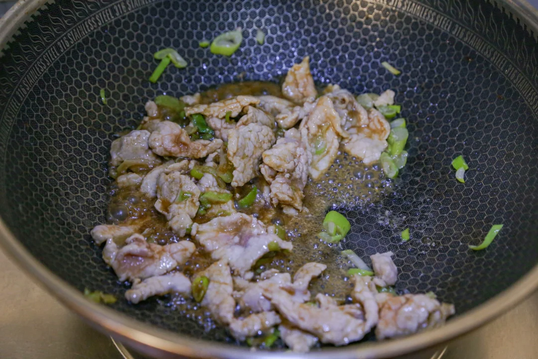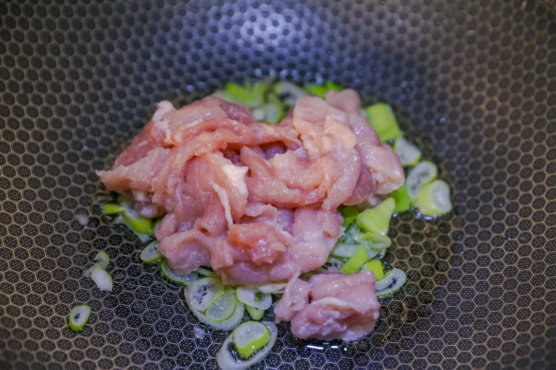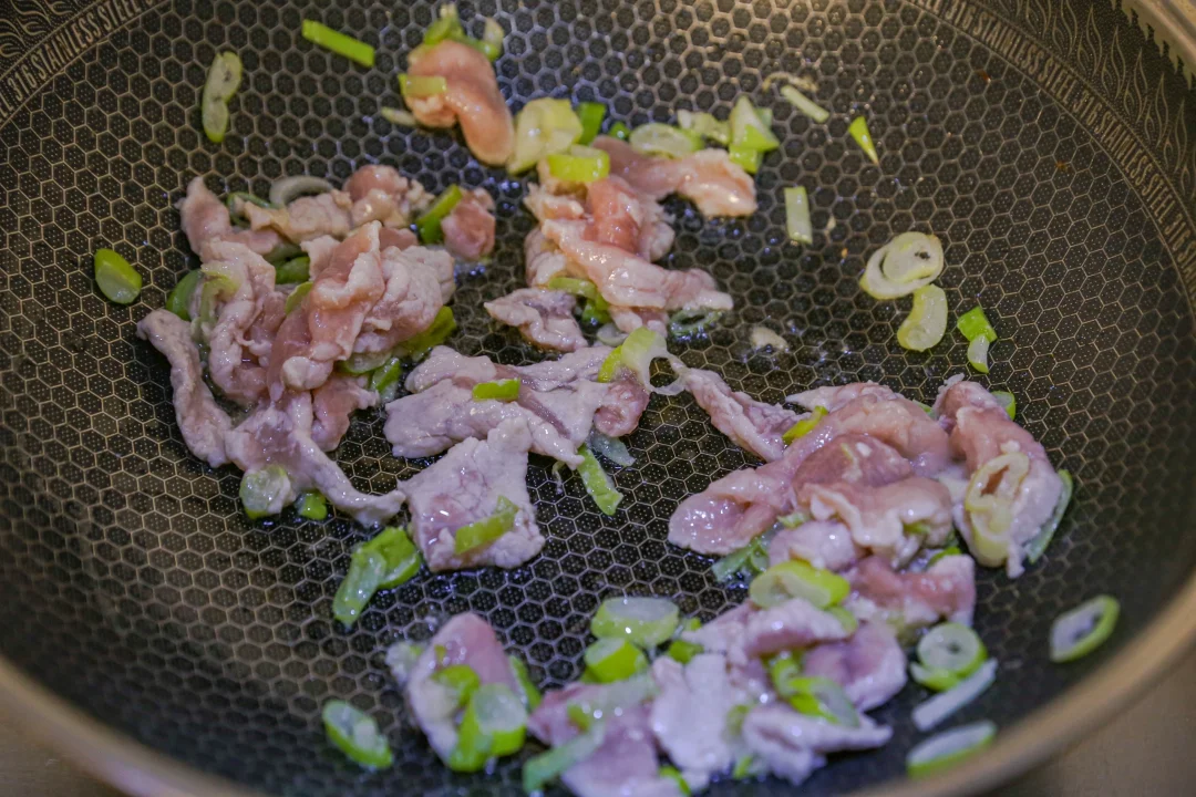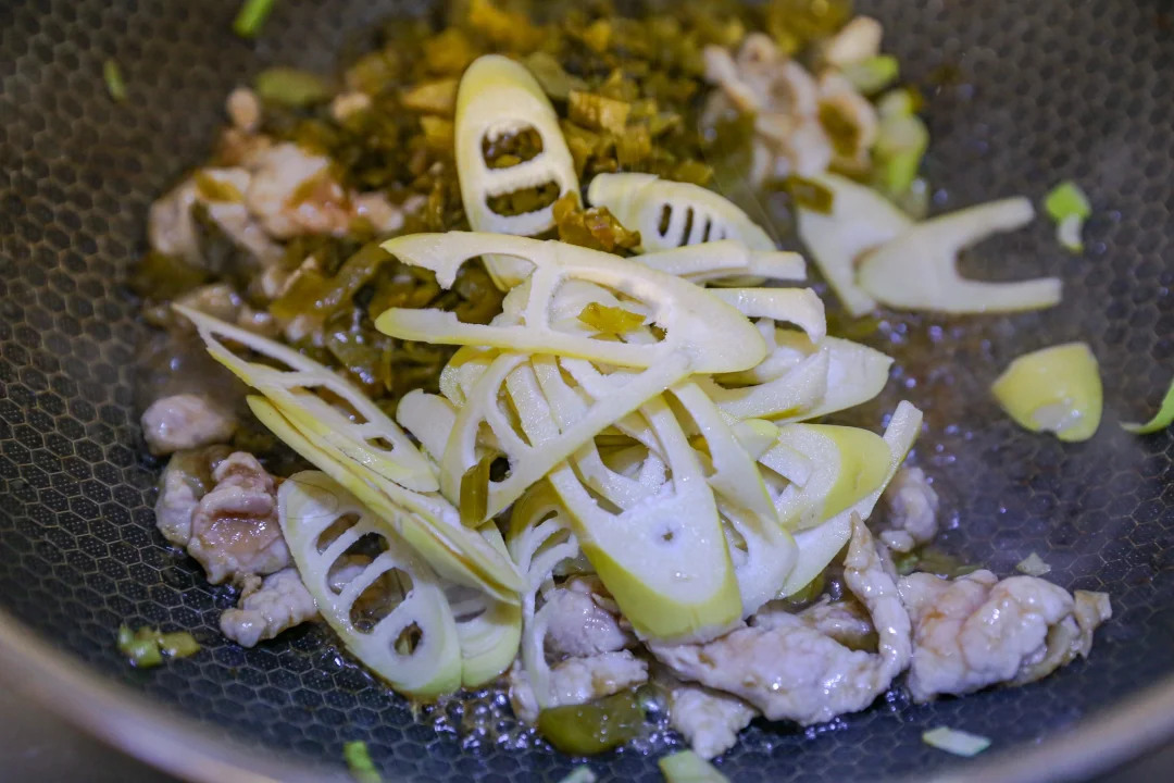 2:炒锅置火上下猪油(15克),将肉片倒入略煸,随即下笋片,放入酱油,再煸炒数秒钟,然后加入雪里蕻菜和沸水50克炒匀,约五秒钟起锅。锅内加沸水300克,滗入雪菜肉片原汤待用。