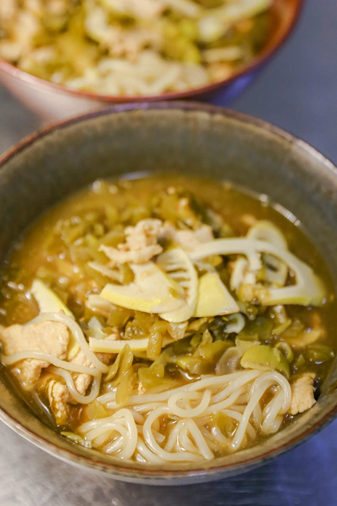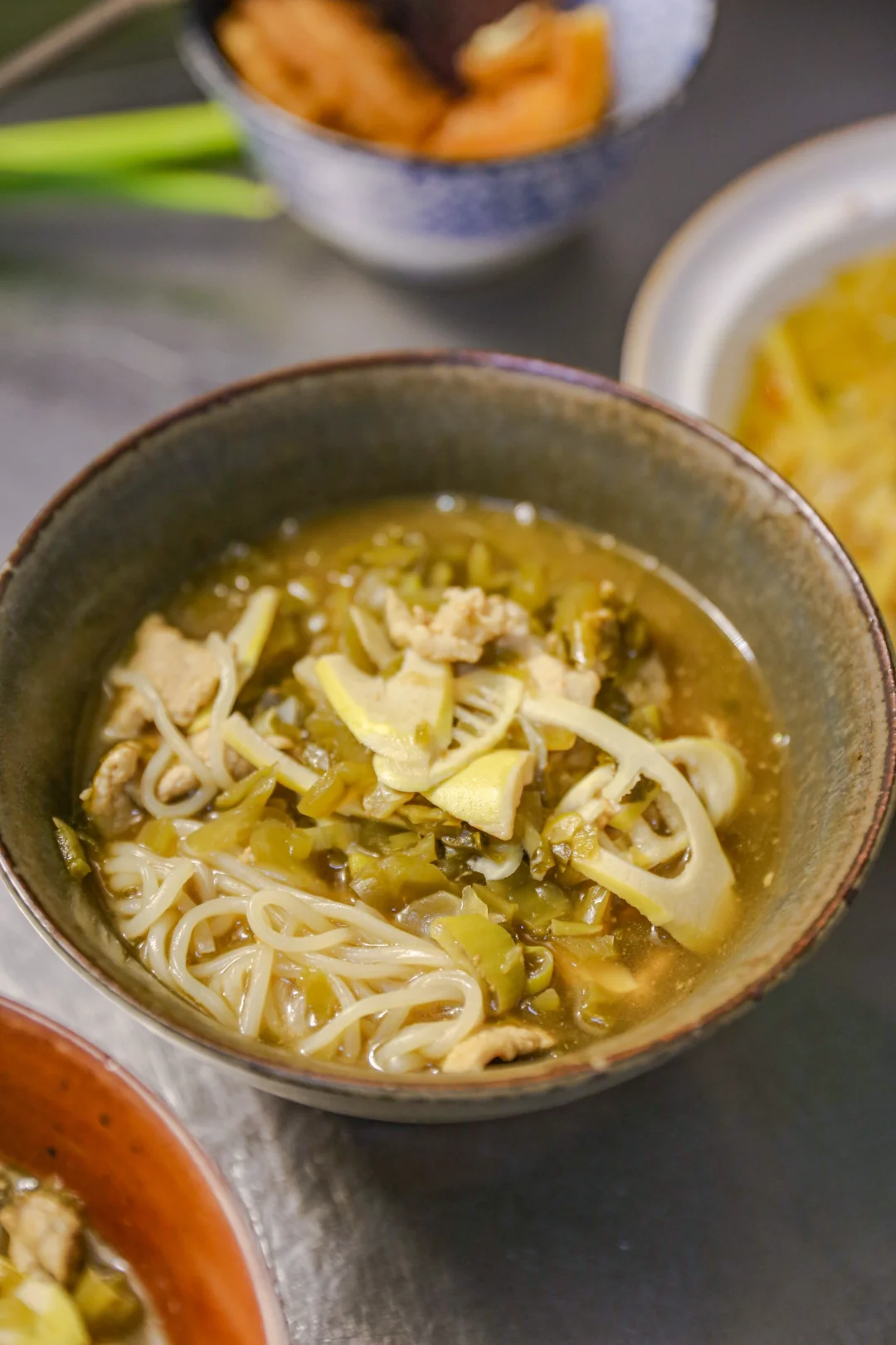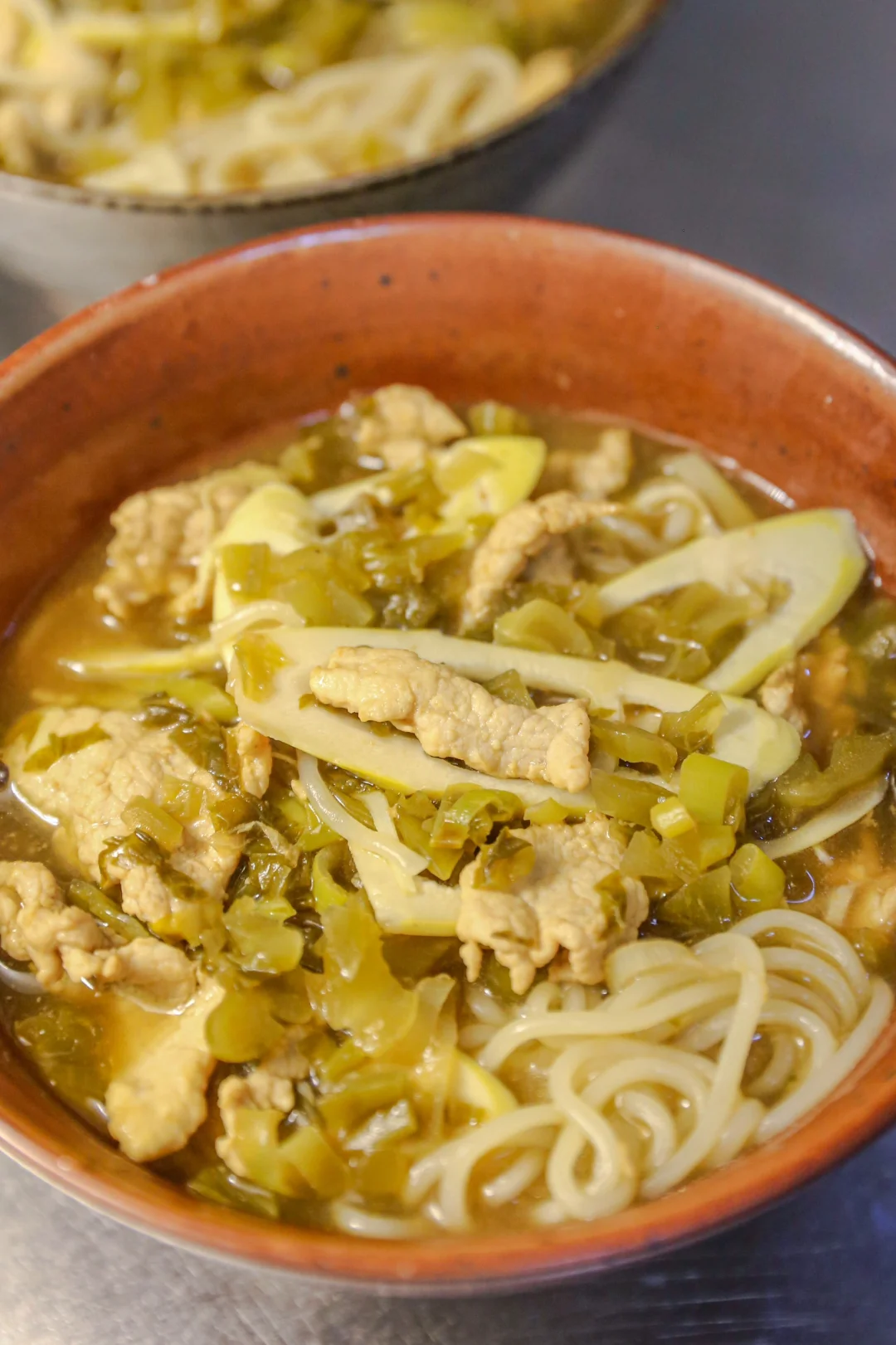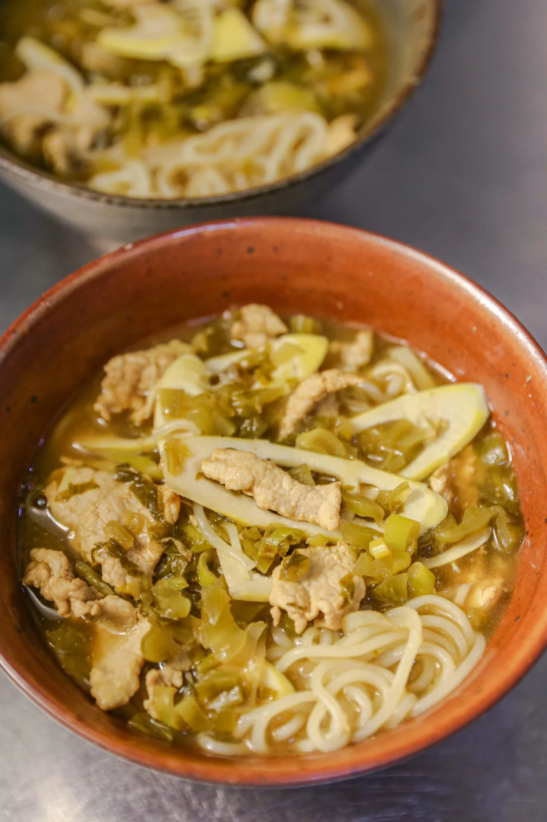此面肉片鲜嫩,笋菜爽口,面滑汤浓,是杭州著名的面点。