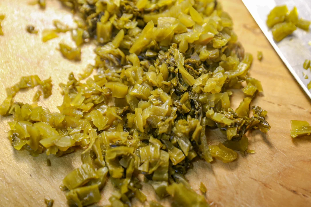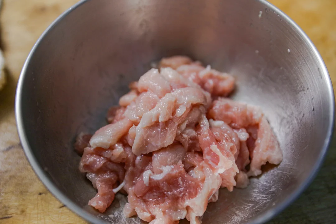 1. 猪腿肉切成4厘米长的片。笋薄片,雪里蕻切末
