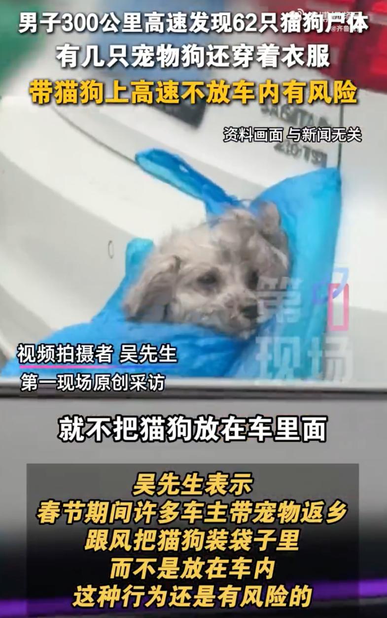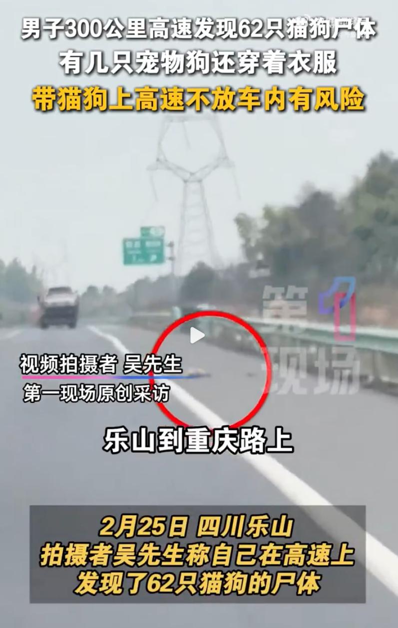 太缺德了!2月25日,四川的吴先生驾车前往重庆,在高速上,竟然发现了62具猫狗的尸体,甚至看到有的狗狗身上还穿着衣服。网友:这次宠物主人太缺德了! 据吴先生描述,这300公里的路程简直成了宠物公墓,他数了一下,一共有62只尸体,七八只是狗,剩下的全是猫。最让人受不了的细节是,好几只小狗的毛发修剪得很整齐,身上还套着小毛衣。这一看就不是流浪狗,而是跟着主人春节返乡、准备回城的宠物狗。 谁能想到,前一秒还在车厢里陪伴主人,后一秒就冰冷地躺在水泥路面上,甚至遭遇密集的二次车祸。这些悲剧的发生,往往就在一瞬间:或是窗缝开得太大,宠物受惊跳窗;或是宠物箱没固定牢,直接从后备箱或皮卡后斗跌落。 这事传到网上后,网友们都不干了。 有同样走这条路线的网友惊呼,往年从没见过这么多,今年实在太离奇了。 更有网友愤怒建议,这种行为不仅是对生命的不负责,更是对后车造成了巨大的安全隐患,必须让前车主人负全责并重罚! 在我看来,这不仅仅是爱不爱宠物的问题,更是法律与责任的缺失。 根据《道路交通安全法》的相关规定,机动车载物行驶时,掉落、遗洒、飘散载运物造成他人损害的,应当依法承担赔偿责任。 宠物属于主人的财产,如果因为主人没固定好航空箱或没关好窗导致宠物坠落,引发后车躲避不及造成交通事故,宠物主人不仅要承担民事赔偿责任,甚至可能面临行政处罚。 很多主人觉得我家狗乖,不会跳窗,或者放在车后面挂着没事。但在高速行驶的情况下,任何一点噪音或颠簸都可能让宠物失控。一旦掉落,它们根本没有生还的可能。 试想一下,后车司机在时速120公里的情况下,突然发现前方掉下一个重物,本能地紧急避让或刹车,极易引发多车追尾甚至侧翻。这时候,宠物主人的疏忽就是在拿别人的命开玩笑。 说白了,养宠从来不是一时的欢喜,而是一辈子的责任。既然带它出门,就该买合格的宠物箱,系好专用的安全带。别让那一点点疏忽,把本该陪伴你的宠物,变成了高速公路上灵魂。