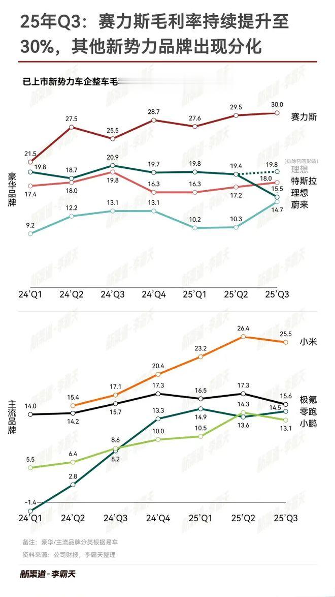要知道,目前大多数新势力品牌的毛利率,都在10-20%之间,比如特斯拉是18%,理想在20%左右,蔚来则只有14.7%,和它们比,赛力斯不知不觉就活成了各家车企梦中的样子。