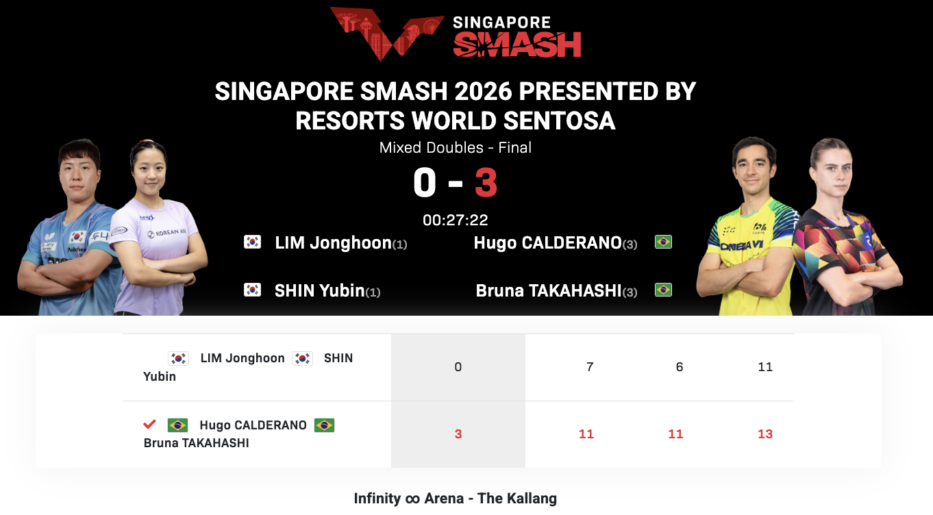 WTT新加坡大满贯丨混双决赛卡尔德拉诺/高桥·布鲁娜🇧🇷3-0林钟勋/申裕斌🇰🇷【11-7,11-6,13-11】 卡尔德拉诺/高桥·布鲁娜🇧🇷获得WTT新加坡大满贯混双冠军🥇🎉林钟勋/申裕斌🇰🇷获得WTT新加坡大满贯混双亚军🥈