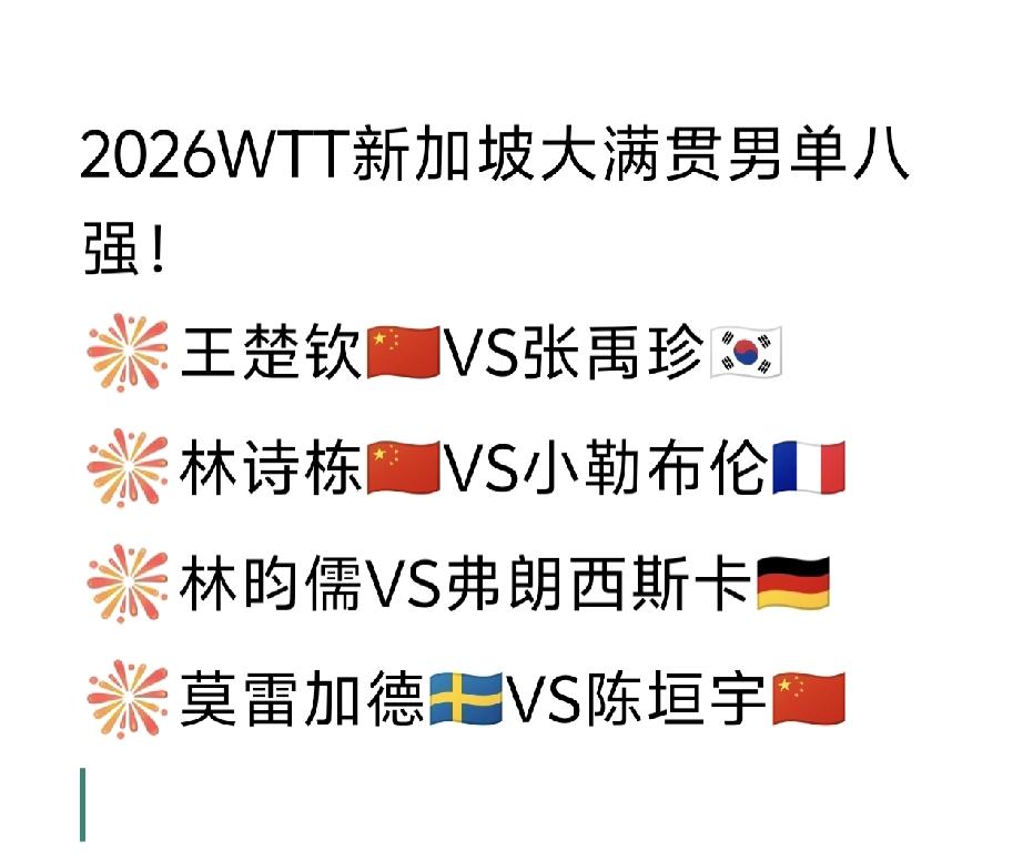 日乒男队没有一个晋级男单八强的[捂脸]! 2026WTT新加坡大满贯男单八强新鲜出炉,如图所示。 不管咋说,上下半区国乒选手都有人镇守,哎呀!细看看下半区的陈垣宇真是势单力薄啊[捂脸]。 不过已经很不错了,国乒三席,其余五个席位被五个协会各占一席。 楚钦、石头、图图继续加油!争取包揽冠亚军啊[奋斗]!