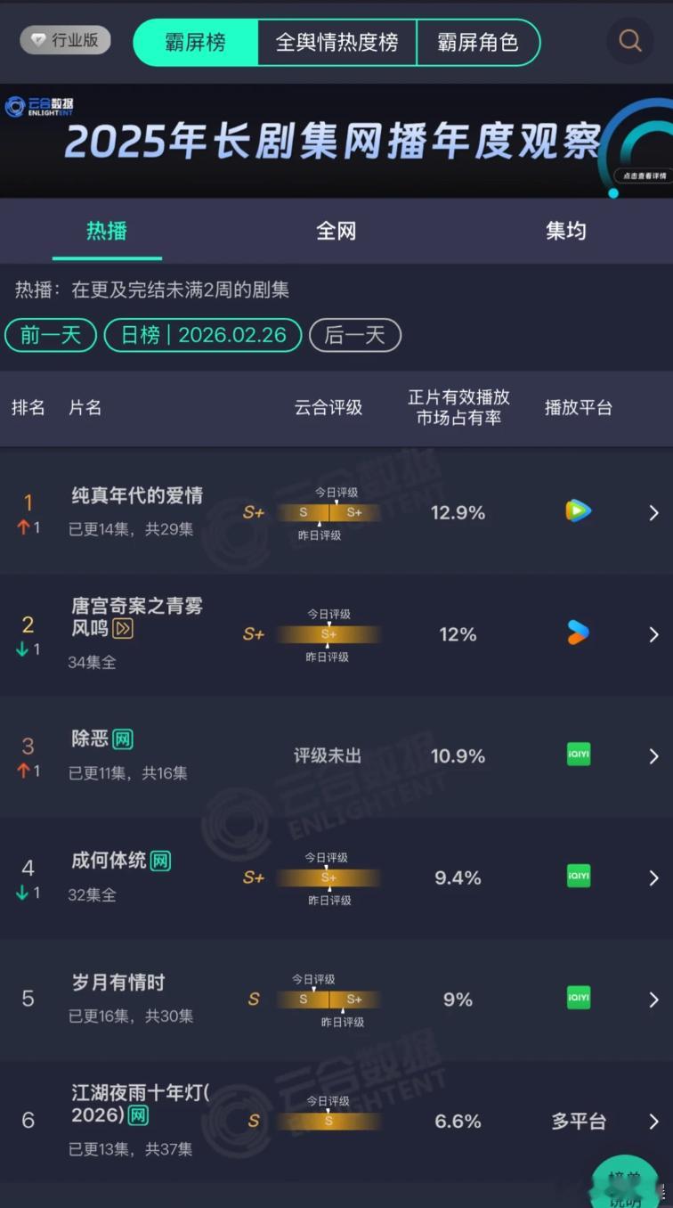 陈飞宇偏偏你最争气从人气爆款到央视上星大剧,陈飞宇始终用作品说话。《纯真年代的爱情》拿下云合S+,热度收视一路高歌,他塑造的方穆扬温柔细腻、鲜活立体,演技持续进阶,每一步都走得扎实漂亮,未来可期!
