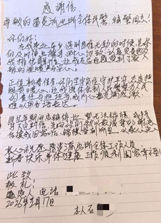 2月17日,黑龙江省海伦市公安局雷炎派出所收到一封感谢信。原来,2月10日,广东省东莞市的石女士连夜赶赴海伦市,向海伦市公安局雷炎派出所寻求帮助,希望能找到失联多日的儿子。最终,在民警的全力搜寻下,失联男子被找到。