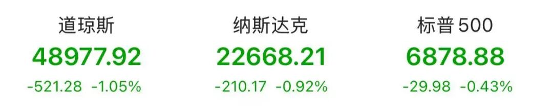 截至收盘,标普500指数跌0.43%,报6878.88点;纳斯达克综合指数跌0.92%,报22668.21点;道琼斯工业平均指数跌1.05%,报48977.92点。