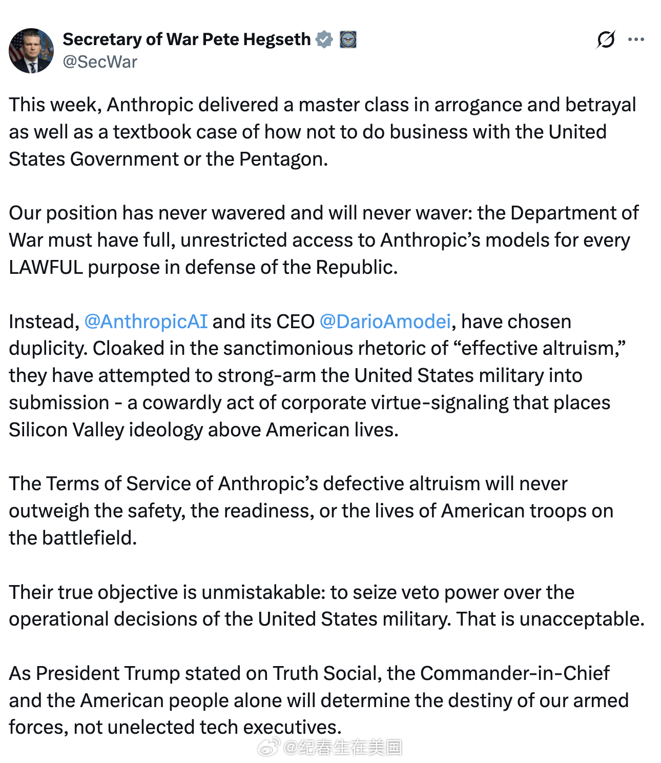 正如川普总统在 Truth Social 上所说,决定美国武装力量命运的,只能是三军统帅和美国人民,而不是未经选举产生的科技公司高管。