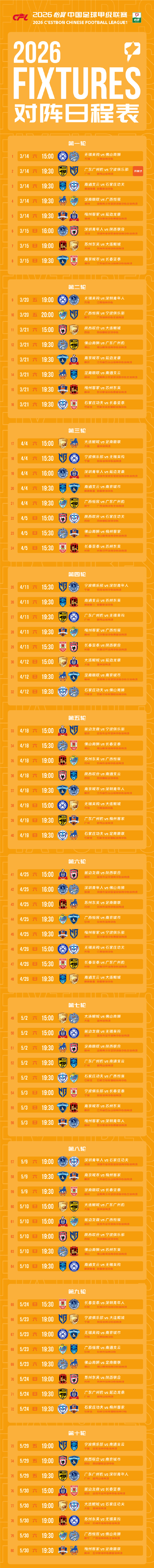 2026中甲赛程:3月14日开赛,揭幕战广州豹vs宁波俱乐部