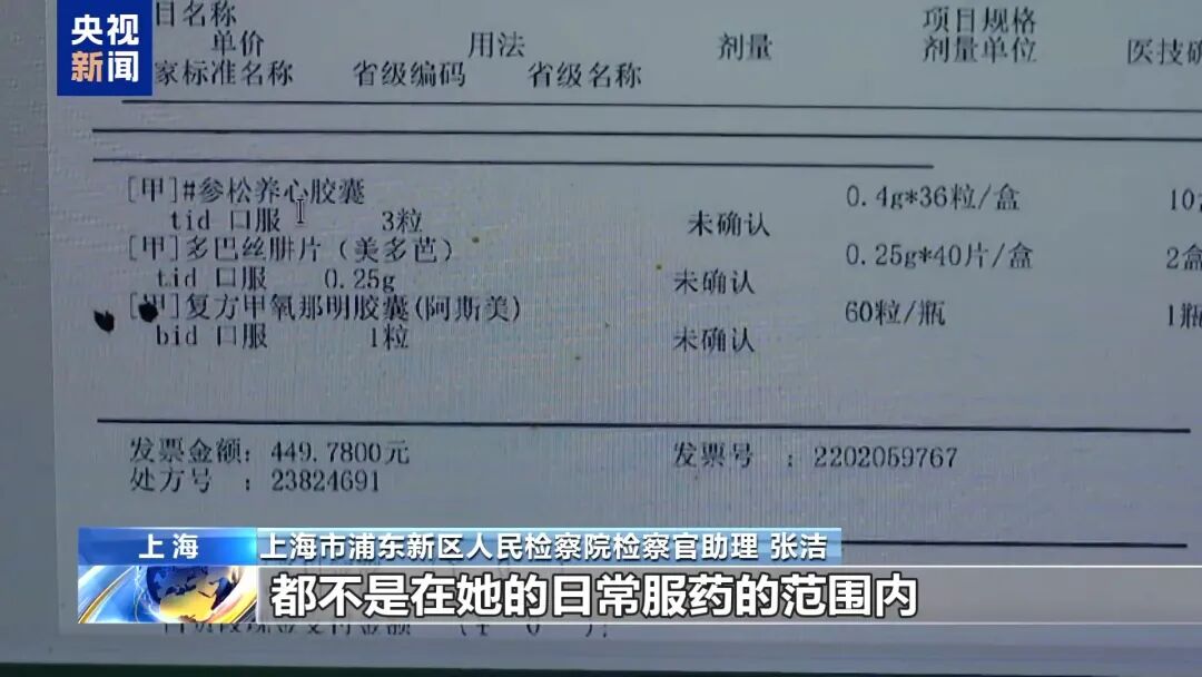 上海市浦东新区人民检察院检察官助理张洁:我们可以看出她这一次开出来药的总金额是449.78元,自己现金支付了67.46元,国家医保统筹基金是支付了382.32元。