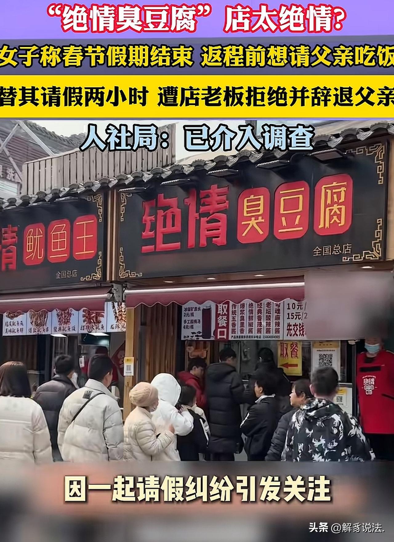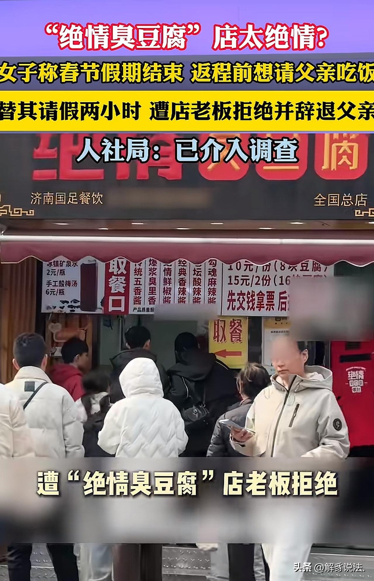 济南,男子是一家名为“绝情臭豆腐”的员工,过年期间店里非常忙,只在年三十放了一天假。其女儿从杭州回家过年,遗憾只和父亲吃了一顿年夜饭。于是,在临走时,她打电话给父亲老板,希望在晚11点后给父亲请假两个小时,陪父亲再吃一顿饭。没想到,遭老板果断拒绝,不近人情的说:一分钟都不行。随后,其父亲被辞退!女子怒了,接下来这样做了…..网友:店名就是绝情,搞笑的是老板更绝情。 正月初五的济南,宽厚里的灯笼还亮得晃眼,可李师傅的心里,却没半点年味儿。 他是“绝情臭豆腐”店的炸锅师傅,干了快三年,手里的油锅从早到晚咕嘟冒泡,忙起来常常要到凌晨才能收工。 这个春节,他就除夕歇了一天,和在杭州工作的女儿李女士,只匆匆吃了一顿年夜饭。 李女士看着父亲每天拖着疲惫的身子回家,心里不是滋味。 她正月初六就要回杭州,这一走,又是一年见不着。离家前,她就想再陪父亲吃顿踏实饭,哪怕只有两个小时。 晚上九点,李女士鼓起勇气给老板打了电话。她特意选了晚上十一点后,店里客流最少的时段,还主动说:工资该扣就扣,绝不麻烦店里。 可电话那头,老板的声音硬邦邦的,没半点商量余地:一分钟也不行! 挂了电话没多久,李师傅的手机就响了,是老板的训斥,还撂下狠话:再提请假,明天就别来了! 老实本分的李师傅哪见过这阵仗,赶紧跟女儿说:算了娃,别犟了,爸不饿。 李女士又气又心疼。父亲勤勤恳恳,平时家里有事儿都极少请假,就为了一顿离别饭,怎么就这么难?她越想越委屈,索性直奔宽厚里的门店。 店门口还排着长队,那块“爱心商户”的牌子,在夜色里格外刺眼。 李女士站在店门口,对着来往的路人,哽咽着说出了整件事:我就想请我爸吃顿饭,怎么就这么绝情? 有人把这一幕拍了下来,发到网上,瞬间就炸了锅。 网友们一边倒地心疼这对父女,“绝情臭豆腐”这个名字,成了最大的讽刺。 记者找上门,想问问老板情况,店里的工作人员只冷冷地回了一句:“关你什么事!”说完就挂了电话。 这事儿很快传到了济南市历下区人社局。2月26日,官方回应,已经会同街道介入调查处置。 《劳动合同法》第48条规定:用人单位违反本法规定解除或者终止劳动合同,劳动者要求继续履行劳动合同的,用人单位应当继续履行;劳动者不要求继续履行劳动合同或者劳动合同已经不能继续履行的,用人单位应当依照本法第87条规定支付赔偿金。 从法律角度来看,李师傅在工作中无任何失职、违纪行为,仅仅因为请假两小时陪伴女儿就被老板无故辞退,已经构成违法解除劳动合同。 按照法律规定,李师傅既可以要求回到店里继续工作,也可以拒绝继续履行合同,并要求老板支付相应的双倍赔偿金。 老板的做法不仅不近人情,更是明显违反劳动法律,相关部门介入调查后,会依法维护劳动者的合法权益。 眼下,李女士已经委托了律师,李师傅也在等一个说法。 那顿没吃成的离别饭,成了压在父女俩心头的石头。而那家生意依旧红火的臭豆腐店,不知道还能不能懂,比生意更重要的,是人心。 此事曝光后,网友也给出了不同看法: 从这件事情上看到的,并不仅仅是老板多绝情的问题,而是反映出底层人民群众生活艰辛的问题。从店家来说,春节是旺季,排班排好了,这是员工都认可和接受了的事。如果员工仅仅为了跟女儿吃顿饭而不是别的特殊情况请假,个人觉得是不合适的。而从员工的角度来说,这一请假要求,外人看来其实并不高。如果他有个相对体面、轻松的职业,这压根儿就不算个啥事。 老板立马辞退员工来看!他们的工作安排是能够调整的!并不会因为请两个小时的假而影响正常运转。还有个前提条件,还是员工常年都没请过假。而且请假的时间是客流少的半夜11点以后。 绝情臭豆腐,老板,真是够绝情的!因为员工的子女为其请假两个小时,就是想跟父亲吃顿饭,而被绝情的老板,绝情的拒绝!!这家店估计也快绝情关门大吉了! 欢迎关注@解豸说法.