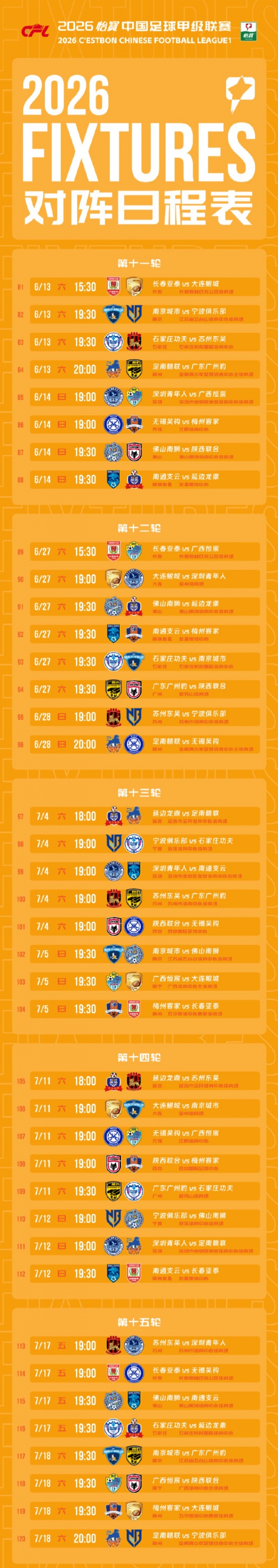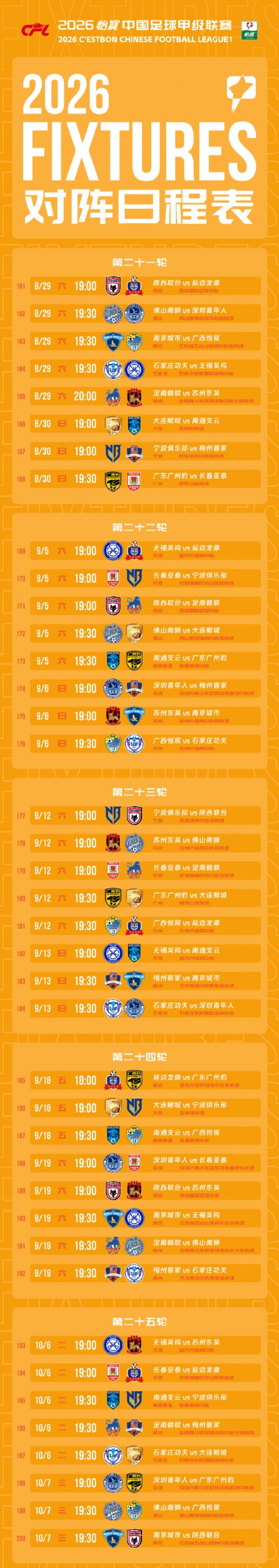 直播吧2月28日讯中甲官方公布2026赛季中甲赛程,新赛季中甲3月14日-11月7日进行,揭幕战广州豹vs宁波队。