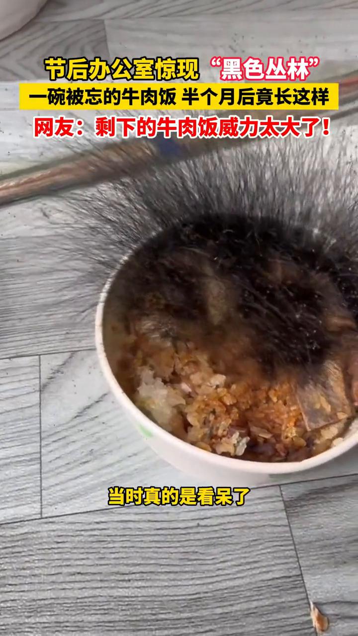 节后办公室惊现"黑色丛林",一碗被忘的牛肉饭半个月后竟长这样。 网友:剩下的牛肉饭威力太大了!合肥巢湖的尹先生,这个春节回老家过年,却把一碗给小狗吃剩下的牛肉饭忘在了办公室。当他节后返回,推开办公室门就闻到一股刺鼻的霉味。循着味道找去,眼前的一幕让他惊呆了。 声音来源:尹先生。完全没想到会变成这样,(菌丝)起码有数百根,当时真的是看呆了。那碗被遗忘半个月的牛肉饭早已面目全非。碗口之上密密麻麻竖起了黑色菌丝,像头发一样,高度足有15公分左右,宛如一碗微型的"黑色丛林"。