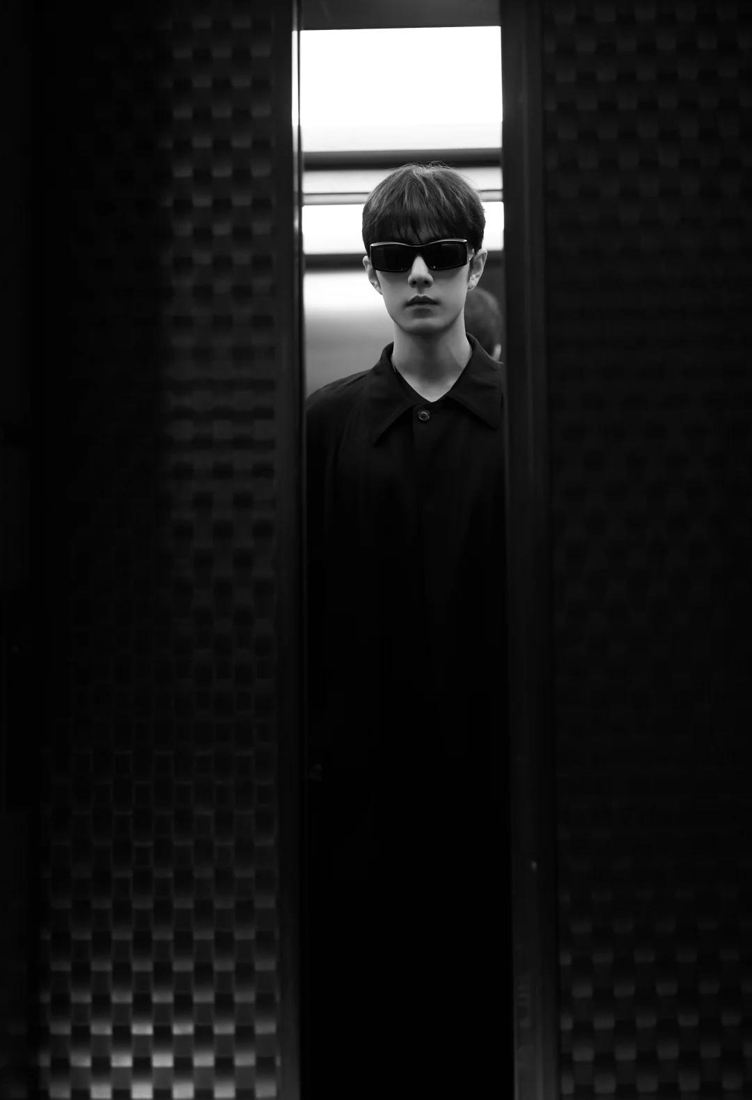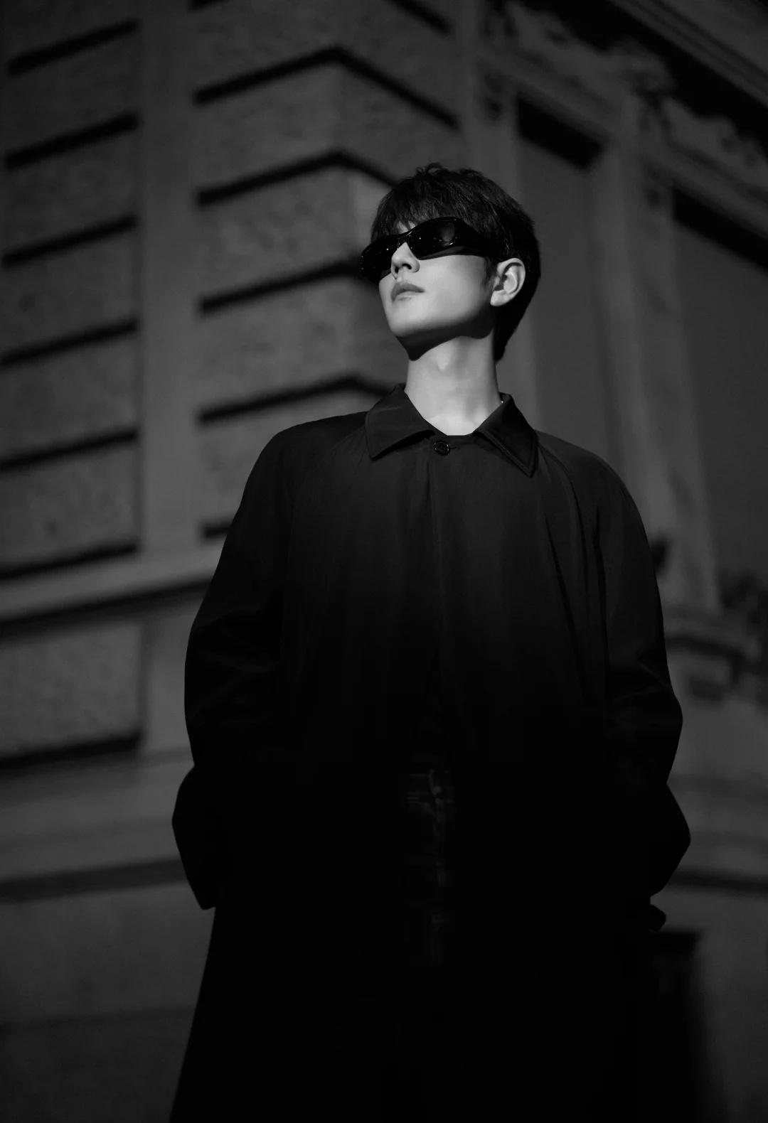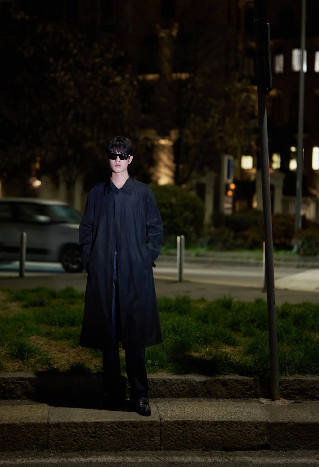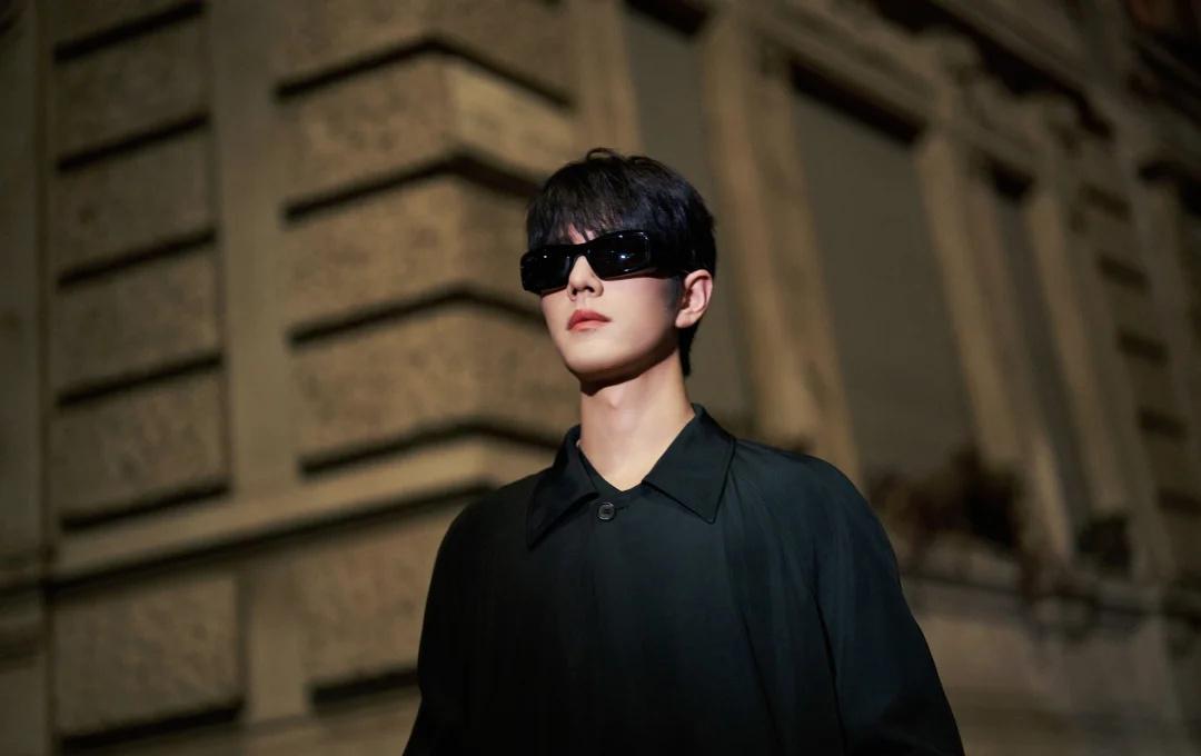 肖战米兰时装周看秀G社生图,这副墨镜的款式又方又大,像90年代港片里反派的标配,