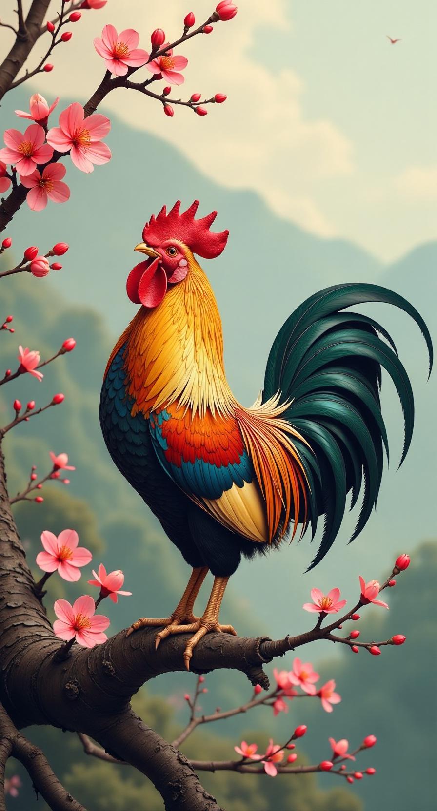 赏析:这幅对联的下联“金鸡唱晓福临门”与上联“喜鹊登梅春报禧”相映成趣。金鸡报晓,象征着新的一天的开始和福气的降临,与喜鹊登梅报春的意境相呼应。