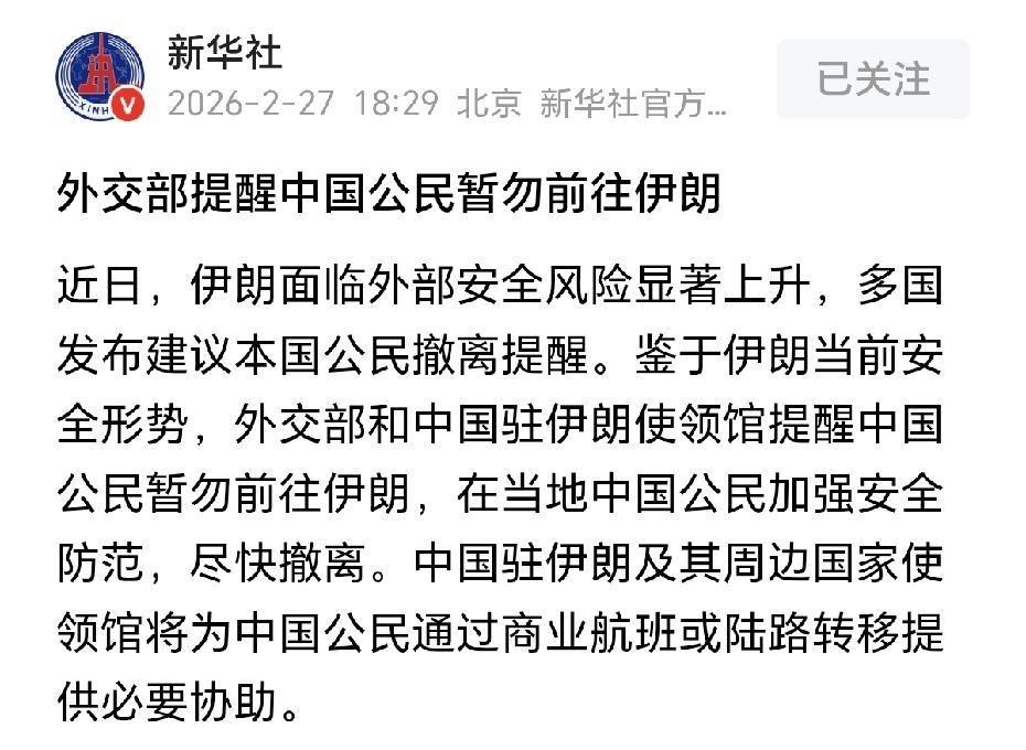 2月27号,中美两国分别发出了撤侨的公告。中国提醒公民不要去伊朗,美国提醒在以色列的公民务必今天离开。 今天已经是2月28日了。但是伊朗那边还是没有任何消息传来啊! 难道又是虚张声势、虚晃一枪? 作为一个中国人,我希望俄罗斯和乌克兰的仗打一辈子。我希望美国和伊朗快点打起来,也打一辈子。