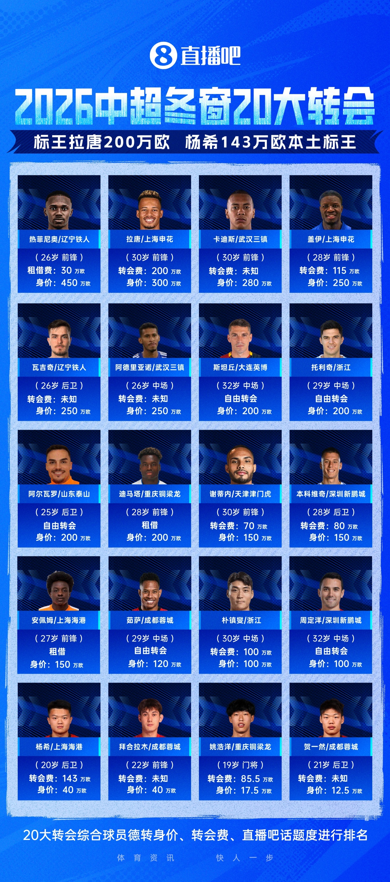 2026中超冬窗转会TOP20[注:数据参考德国转会市场网,20大转会综合球员德转身价、转会费以及直播吧话题度,排名依照德转身价从高至低]