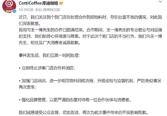 库迪咖啡表示,公司与王一博的合作已圆满结束。“对于此次个别门店的不当行为,我们向王一博先生、粉丝及广大消费者诚恳致歉。”并表示,事发后,已第一时间处理,立即终止涉事门店合作并闭店;加强门店培训,进一步规范物料回收流程,升级巡检与监督机制,严防类似情况再次发生;强化品牌管理,以更严谨的态度对待每一位合作伙伴与消费者。