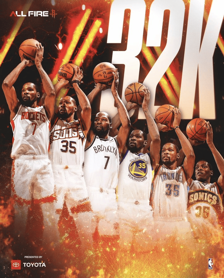 今日,火箭官方晒出一张杜兰特身穿6件球衣的海报:“祝贺凯文-杜兰特得到生涯第32000分!”
