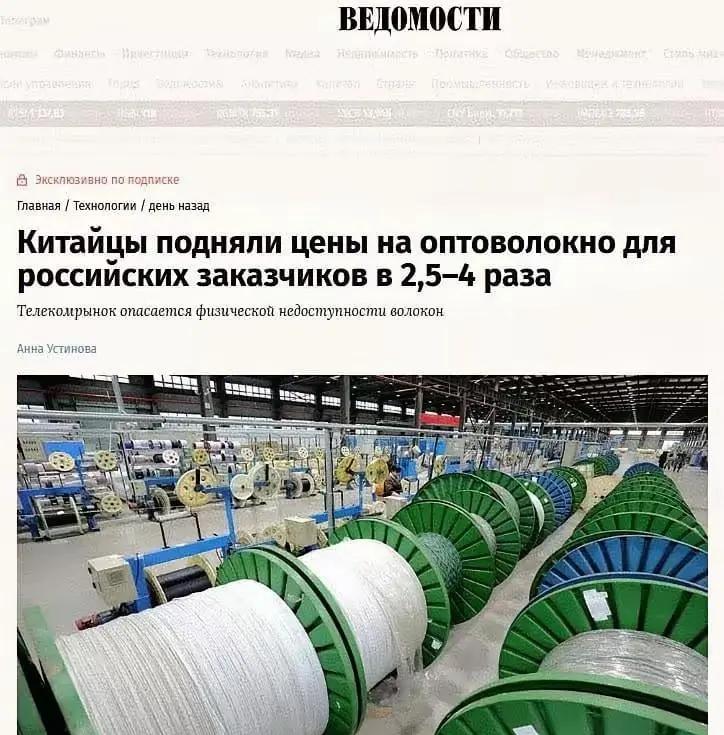 俄罗斯抱怨中国光纤涨价太厉害了,据俄罗斯《导报》报道,从2026年开始,中国供应商对俄光纤报价上调2.5~4倍,由原来的16元,直接上升到25元,俄罗斯线缆企业和运营商都已确认… 针对光纤涨价这一现象,并非中国单方面“抬价”,而是由多重国际因素叠加导致的全球性供应链危机。 重要原因是全球AI算力基建大爆发,数据中心和高速网络对光纤需求暴增,全球产能严重跟不上。有数据显示,2026年全球光纤缺口接近1亿芯公里,AI相关光纤需求同比暴涨超500%。 自2026年起,中国供应商对俄出口的光纤价格普遍上调2.5至4倍。主流型号价格从2025年初的约16元/公里,上涨至2026年1月的40元/公里。 而俄罗斯唯一具备规模化生产能力的“光纤系统”工厂,于2025年4月5日遭乌军无人机袭击,工厂发电设施被毁了,再加上俄罗斯长期受西方制裁,早已失去从美、日、欧等传统渠道进口光纤的可能。在本土产能归零后,中国成为其唯一可靠的供应来源,俄罗斯完全丧失了议价能力。 俄罗斯抱怨中方也没用,原材料涨价,相应的价格幅度随之,因为如果中方不涨价,那中方企业立马面临破产,到时俄罗斯花再多钱也无法买到光纤,所以俄罗斯相关部门应该支持中国的涨价。