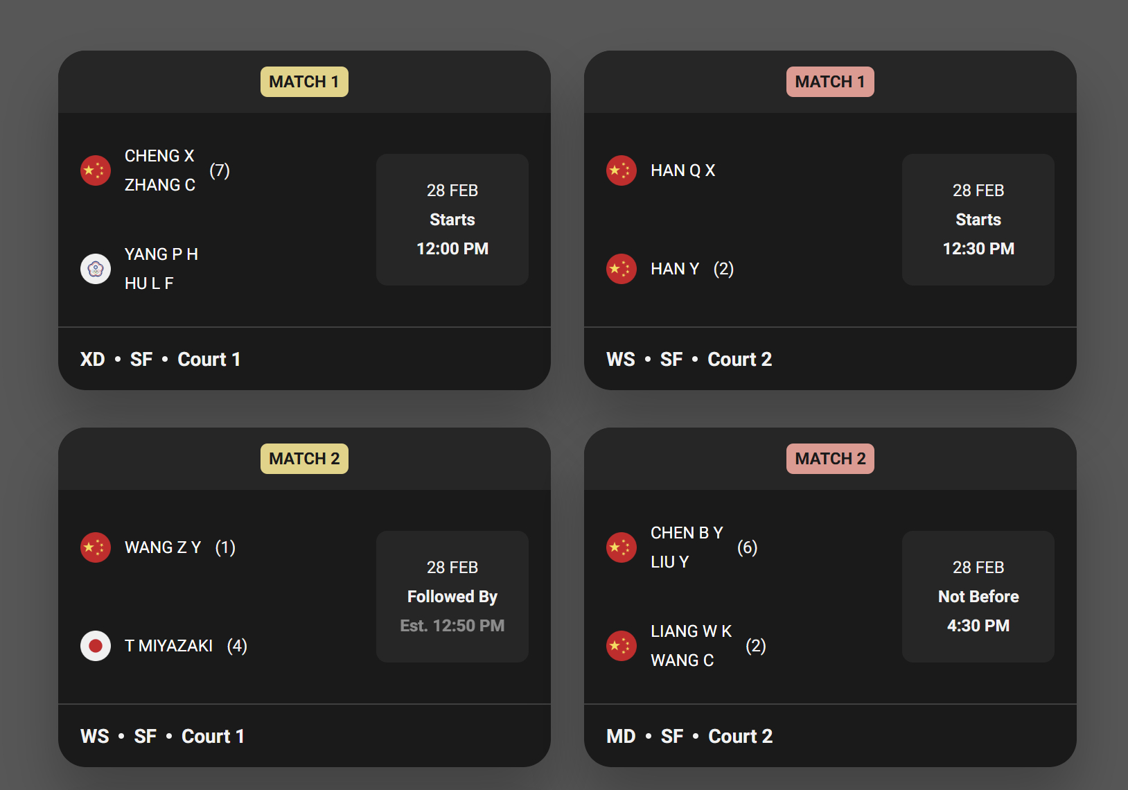 🏸2026年德国羽毛球公开赛 | 2月28日国羽赛程1号场地(北京时间28日19点开始):第一场:混双半决赛 程星/张驰 vs 杨博轩/胡绫芳第二场:女单半决赛 王祉怡 vs 宫崎有花第四场:女双半决赛 李怡婧/王漪朵 vs 阿玛莉亚/拉马丹蒂第五场:鲍骊婧/罗徐敏 vs 许雅晴/宋祐媗