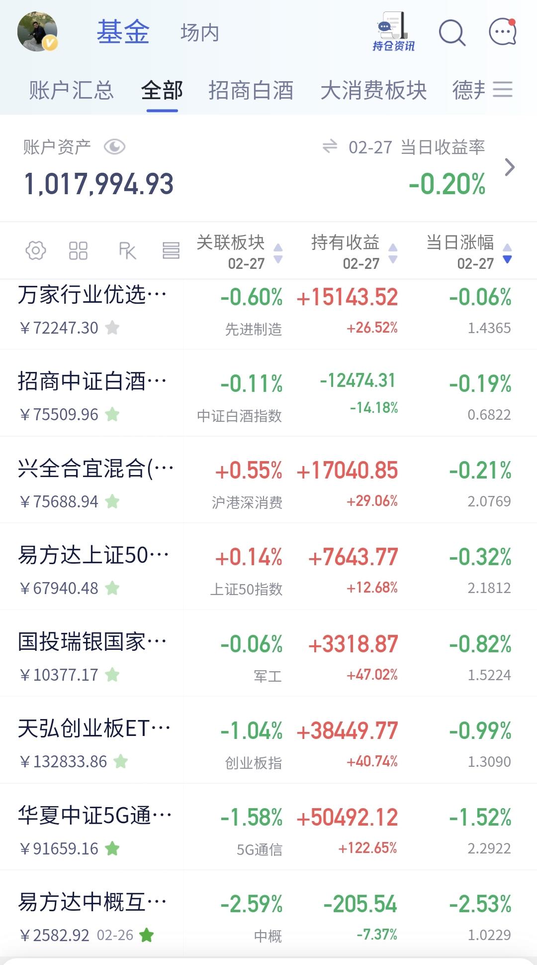 基金:下周再一次止盈或捞回止盈的筹码 昨天基金亏损1990元,基金持有1018368元,现金持有920915元,现金收益26元,资产总额1939284元,最近就是小幅度波动,没有实质性的变化,没有方向性的选择。 上周四个交易日,一盈三亏,一个交易日盈利,三个交易日亏损,周亏损415元。 本月14个交易日,五盈九亏,五个交易日盈利,九个交易日亏损,月亏损17227元。 今年以来收益26771元,收益率2.70%,跑赢了全国71.15%的基民,也跑赢了沪深300指数1.74%的上涨幅度。 近一年以来收益383504元,收益率27.51%,跑赢了沪深300指数18.71%的上涨幅度。 持有的基金中,昨天晚上净值更新以后,上涨幅度最大的三个板块是:AI应用板块,可控核聚变板块,新能源汽车板块,下跌幅度最大的三个板块是:5G板块,创业板指,军工板块。 欧洲市场昨天晚上涨跌不一,英国上涨了0.59%,德国下跌了0.02%,法国下跌了0.47%,涨跌幅度都不大。 美股市场昨天晚上下跌,标普指数下跌了0.43%,纳斯达克指数下跌了0.92%,道琼斯指数下跌了1.05%,下跌幅度也都不大。 我最近经常说的是进行再一次止盈,每个人需要自己的情况来做出适合自己的决定,每个人的情况是不一样的,同样的上涨和下跌做出来的应对也是不一样的。 我经常也说均衡配置,均衡配置是针对资金量稍微多一点的人来讲的,均衡配置就是不要把鸡蛋放在一个篮子里面,如果你有很多个鸡蛋,你肯定是不能放在一个篮子里面,如果你只有一个鸡蛋,你肯定是只能放在一个篮子里面,所以,均衡配置也是根据不同的人有不一样的结果。 资金量多的人,第一要务是求稳,第一要务是本金的安全,资金量少的人,第一要务是挣钱,第二要务也是挣钱,本金的安全倒不是显得那么的重要,也就是人们常说的富贵险中求,当积累到一定的资金量以后,还是要回归到求稳,不然有可能会一夜回到解放前。 我下周还是继续做好再一次止盈的准备,但如果外围局势能够让我们形成一个黄金坑,那我会毫不犹豫捞回去年止盈的筹码,现在的主动权就是在我自己手上,如果市场继续向上创出4190点新高,我就会考虑找机会进行再一次止盈,如果市场向下砸出一个黄金坑,我就捞回前期止盈的筹码,这就是进退自如,这就是从从容容。 花1秒钟点赞,花30秒钟评论,就是对我最大的支持,谢谢大家的支持。
