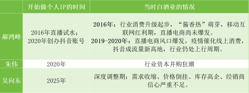 另外,三人开始做个人IP的时间点以及当时的行业环境也不同:郝鸿峰是在电商红利与直播兴起阶段开始做个人IP,顺应的是线上渠道崛起的趋势;朱伟活跃于酱酒扩张与并购活跃阶段;吴向东发力做个人IP,则发生在行业下行与信心波动期。