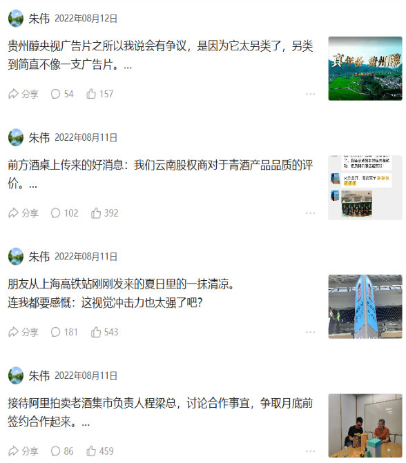 贵州醇酒业董事长朱伟的自媒体生涯始于2020年,他以今日头条为主阵地,坚持高频日更,而且什么都发,从分享企业发展规划,到披露企业发展情况;从发表行业观察分析,到分享个人工作感悟;从“带货”企业产品,到闲谈白酒文化等等。
