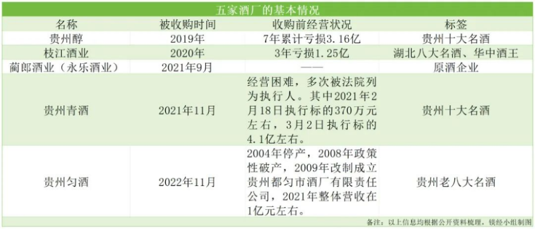 在被收购前,这些酒厂的经营情况都不是很好。贵州醇和枝江酒业在被收购前都深陷亏损,其他几家酒厂并未披露过相关数据。