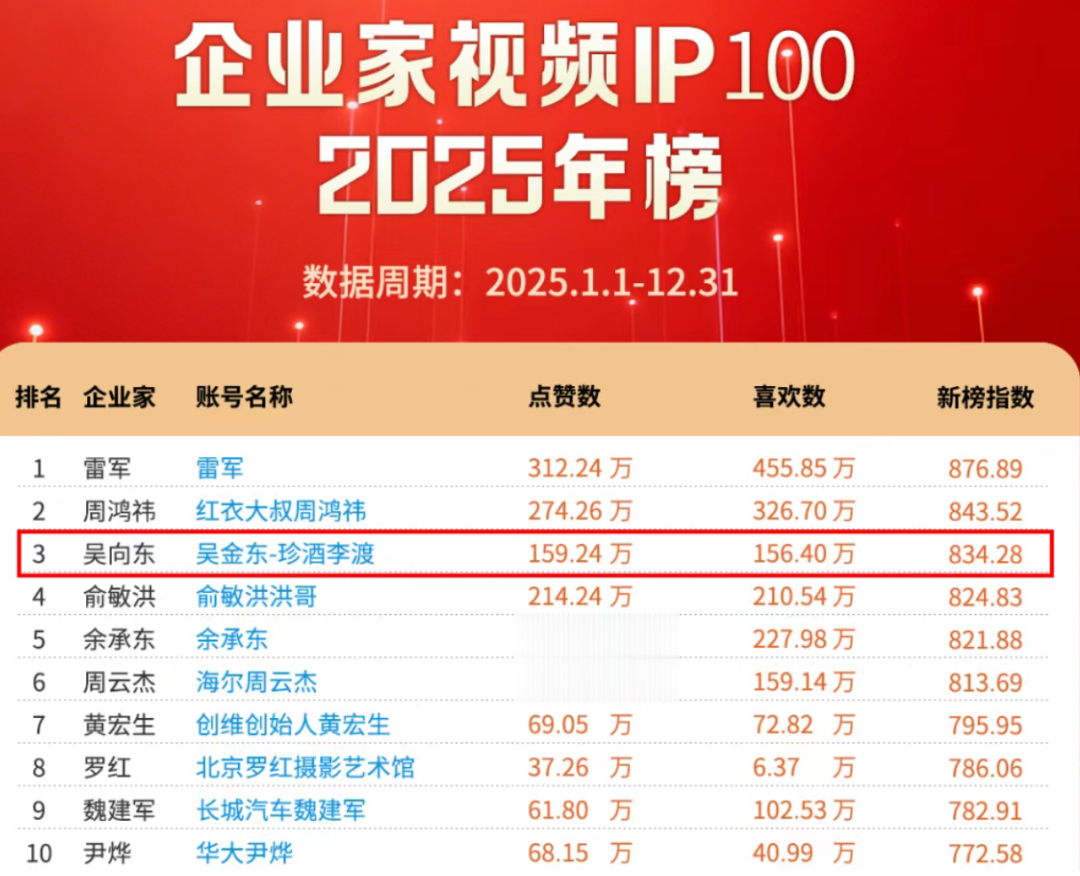 2025年末,在正和岛和新榜联合发布的榜单中,珍酒李渡集团董事长吴向东的个人视频号“吴金东-珍酒李渡”跻身《企业家视频IP100榜单》前三,成为前十名中唯一的酒企代表。