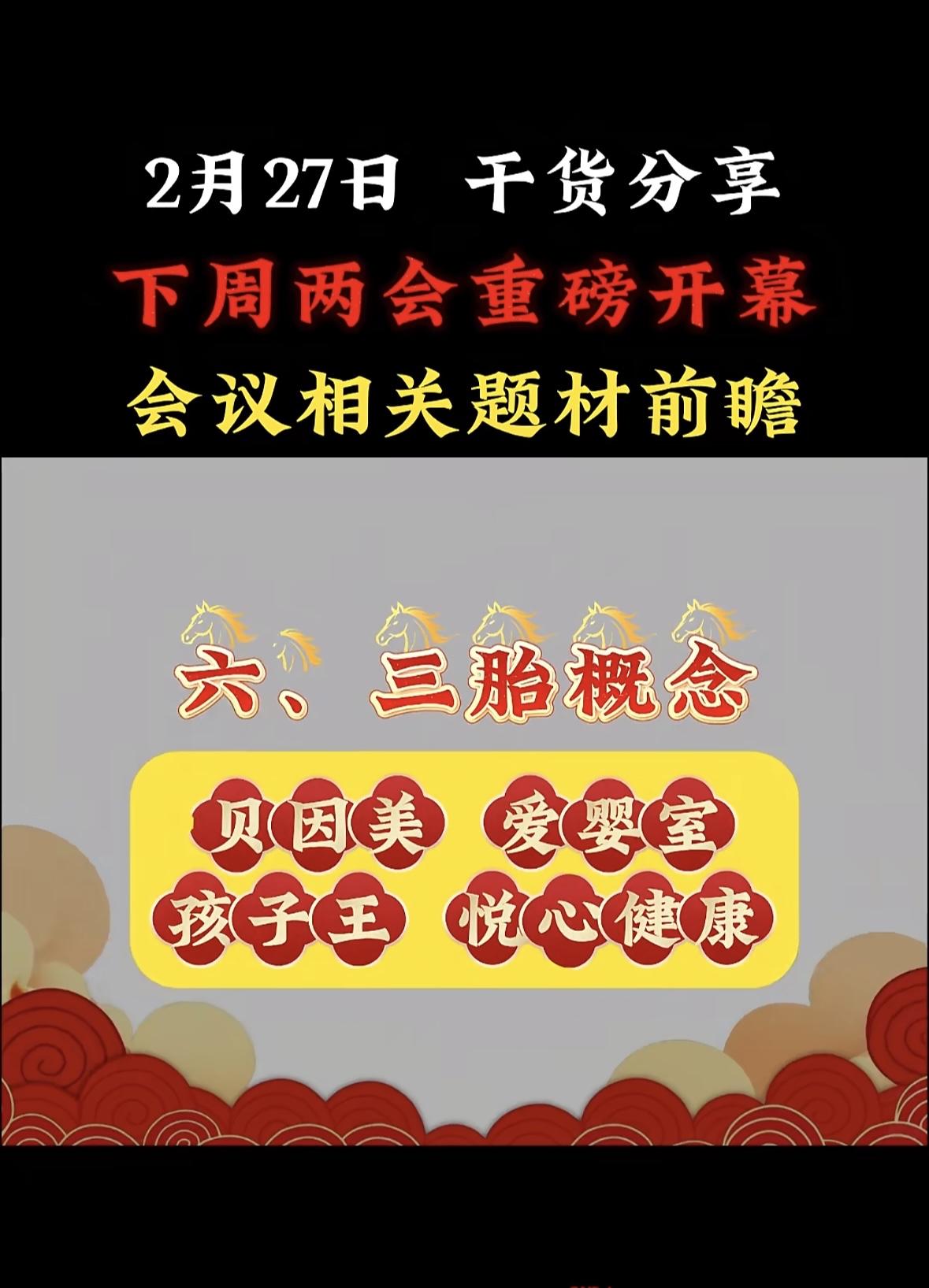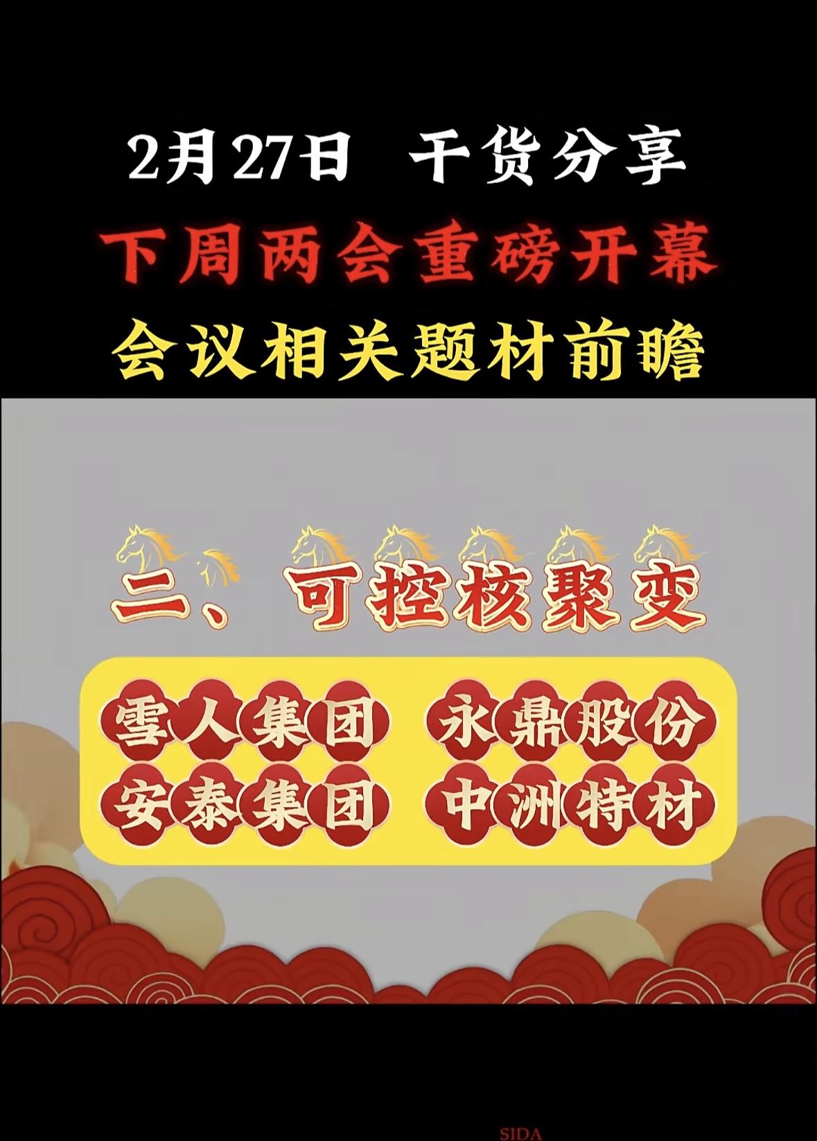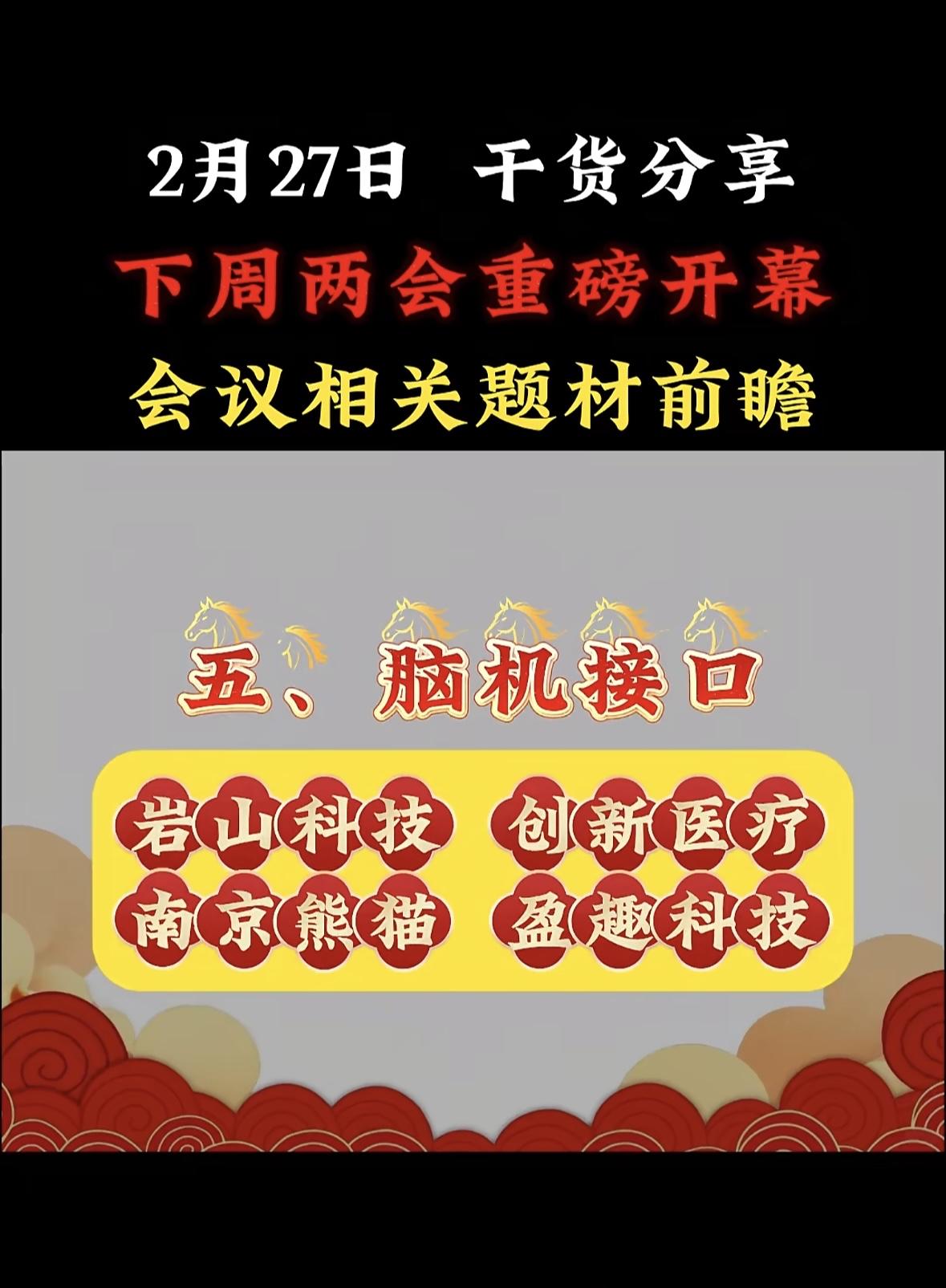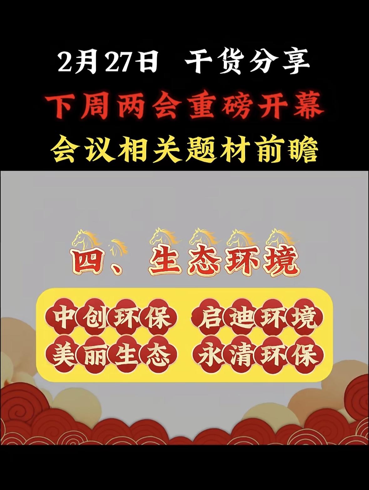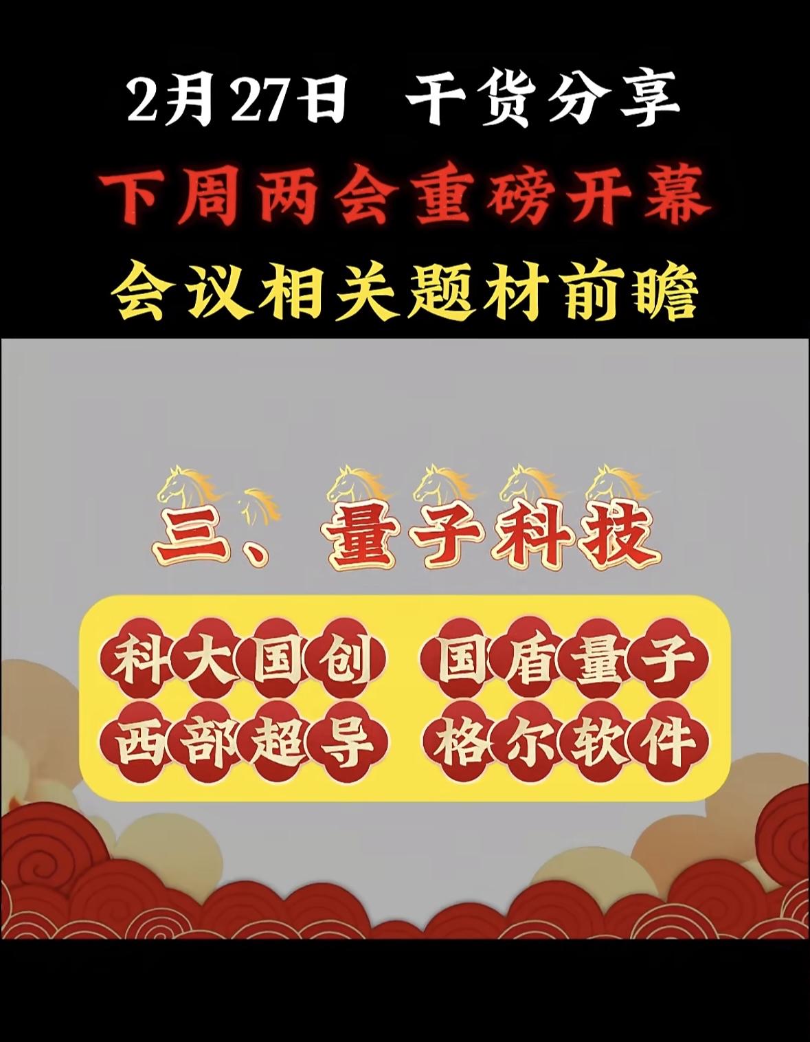 下周两会重磅开幕,这可是年度大事,相关题材值得好好前瞻。 从过往来看,民生领域向来是焦点。像教育方面,可能会进一步探讨“双减”政策深化、职业教育发展等问题,相关教育企业或许会受影响。环保领域也不容忽视,碳达峰、碳中和目标下,新能源、节能减排题材有望被提及,相关股票说不定会有波动。 科技板块同样值得关注,自主创新、芯片研发等话题可能热度不减。投资者可以提前关注这些领域,说不定能抓住两会带来的投资机遇。