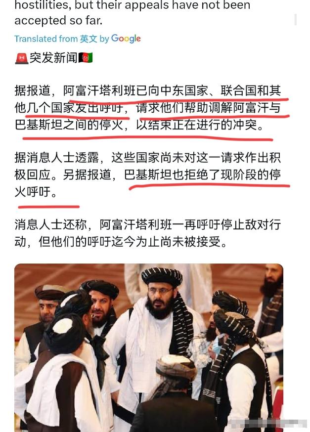 阿富汗被巴基斯坦打怕了,阿富汗塔利班主动求和!2月27日,根据阿富汗时报报道,阿富汗塔利班正呼吁中东国家、联合国和其他几个国家帮助调解与巴基斯坦的停火并停止正在进行的冲突。阿富汗塔利班一再敦促停止敌对行动,但塔利班的呼吁迄今尚未被接受。 阿富汗塔利班主动向中东国家、联合国呼吁调解停火,说白了就是在巴基斯坦的军事打击下实在扛不住了,这场冲突从一开始就没按“有来有回”的剧本走,完全成了巴方单方面的实力秀场。 冲突的根源早就埋在领土和反恐这两件事上,杜兰德线的争议让两国边境就没真正平静过,阿塔一直不承认这条边界,而巴基斯坦则把它当作国家安全的重要屏障,再加上巴方认定阿塔在境内包庇巴基斯坦塔利班等恐怖组织,2025年一年就有1200多名巴基斯坦军民死于武装袭击,这个数字是2021年美军撤出阿富汗时的两倍,其中2月6日伊斯兰堡清真寺的爆炸案就造成36人死亡,“伊斯兰国”公然认领,这些累积的怒火终于让巴基斯坦彻底失去了耐心。 巴方发起的“正义之怒行动”之所以能形成碾压,核心还是硬实力的差距大到无法逾越。 巴基斯坦的现役军人就有66万,再加上近30万准军事部队和宪兵,总兵力几乎是阿塔武装人员的五倍还多,而装备水平更是不在一个维度。 巴军手里的家伙事儿既有和中国联合生产的JF-17“枭龙”战斗机,又有美国制造的F-16战机,还有完整的“雷达探测—指挥—电子战—打击”作战体系,光是2月27日凌晨的空袭,就精准摧毁了阿塔在喀布尔、坎大哈等地的指挥所、弹药库和后勤基地,这些都是阿塔维持作战能力的命脉。 反观阿塔,手里的武器大多是前阿富汗军队遗留、外国军队撤离时留下的旧货,还有些从黑市淘来的零散装备,别说先进战机,就连像样的防空系统都没有,面对巴军的空中打击,只能被动挨炸毫无还手之力。 实战中的战果更是把这种碾压体现得明明白白。 根据巴基斯坦三军新闻局公布的消息,冲突爆发后,巴方仅付出12名士兵死亡、27人受伤的轻微代价,就摧毁了阿富汗方面73个武装营地,损毁115辆坦克和火炮车辆,还直接控制了18个营地,打死的阿方人员超过274人。 而阿塔所谓的“大规模报复”,除了在边境地区进行零星炮击,根本无法对巴方造成实质性威胁,他们宣称击落巴方战机、打死大量士兵的说法,连基本的证据都拿不出来。 更有意思的是,巴军的打击精准度极高,专门锁定军事目标,全程没有造成平民伤亡,反观阿塔在边境的袭击,却多次波及无辜民众,这种作战素养的差距,本质上还是国力和军事实力的体现。 阿塔手里的这点军事力量,在系统化、现代化的巴军面前,就像散兵游勇对抗正规军。 国际战略研究所的数据显示,阿塔的武装人员总数不足20万,而且缺乏统一的指挥协调,武器装备以轻武器为主,重型装备少得可怜,还没有空中支援能力。 而巴基斯坦不仅有完善的陆海空三军体系,还有实战检验过的作战经验,之前在与印度的冲突中,巴军驾驶中国产战机击落过印军“阵风”战机,这种体系化作战能力放在阿富汗战场,完全是降维打击。 比如巴军在边境部署的JF-17战机,既能执行空袭任务,又能进行空中巡逻,阿塔的地面目标在它面前几乎是透明的,而阿塔连基本的防空手段都没有,只能眼睁睁看着自己的阵地被逐个摧毁。 其实早在2025年10月,两国就因为边境交火达成过临时停火,还在卡塔尔、土耳其的斡旋下举行过多轮会谈,但阿塔在反恐问题上始终含糊其辞,拒绝签署书面协议,也不愿彻底清剿境内的巴塔营地,这让巴基斯坦彻底失去了信任。 此次巴方发起跨境打击,就是要打破这种“谈不拢、打不停”的循环,用绝对实力让阿塔认清现实。 阿塔之所以急着求和,就是因为再打下去,手里仅有的那点军事资本都会被消耗殆尽,喀布尔、坎大哈这些核心区域都已经遭到空袭,他们很清楚继续对抗只会输得更惨。 但巴基斯坦这次显然没有停手的意思,国防部长阿西夫直接在社交平台宣布“公开战争”,各政治派别也一致支持军方行动,要求阿塔在支持巴基斯坦和庇护恐怖组织之间做出明确选择。 联合国、俄罗斯、伊朗虽然表示愿意调解,但这些呼吁并没有得到巴方的积极回应,毕竟巴方已经用实力证明,自己有能力解决安全威胁。 阿塔的求和呼吁之所以没人积极响应,本质上还是实力不足导致话语权缺失,在巴方占据绝对优势的情况下,任何没有实际约束力的停火提议,都很难得到认可。 这场冲突也彻底暴露了阿塔执政后的短板,没有足够的军事实力和外交筹码,仅凭意识形态支撑,根本无法应对周边国家的安全诉求,而巴基斯坦则用这场碾压式的打击,再次巩固了自己在南亚地区的军事地位。