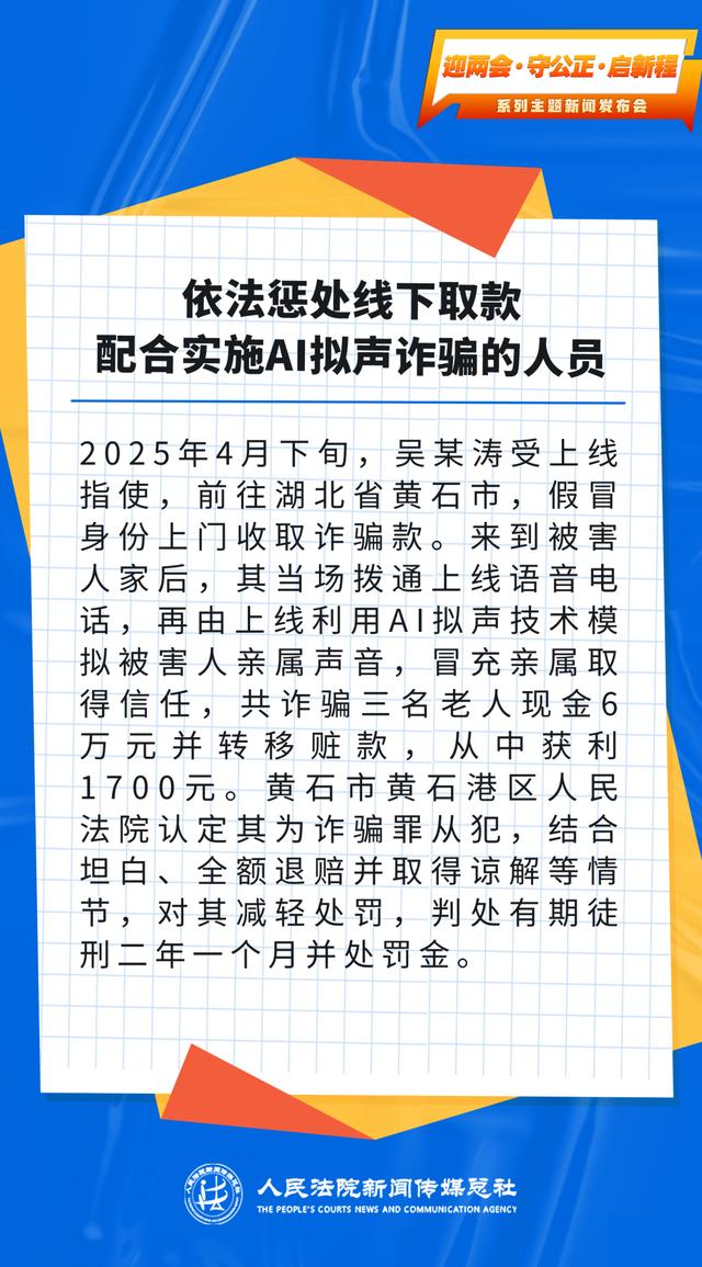 2026年2月26日上午,最高人民法院举行“人民法院依法惩治电信网络诈骗、侵财犯罪工作情况”新闻发布会,会上发布五起电信网络诈骗等侵犯财产犯罪的典型案例。这批案例涵盖跨境虚假投资诈骗、“招转培”诈骗、AI拟声诈骗、“两卡”帮信等多种常见及新型犯罪类型,既体现了人民法院从严惩处跨境电诈集团首要分子、严厉打击各类电诈及关联犯罪的坚定态度,又精准贯彻宽严相济刑事政策,厘清主从犯责任边界、全力推进追赃挽损,切实实现了办案政治效果、法律效果和社会效果的有机统一。让我们通过一组海报,走进这些典型案例,见证司法惩防电诈犯罪的坚实力量。