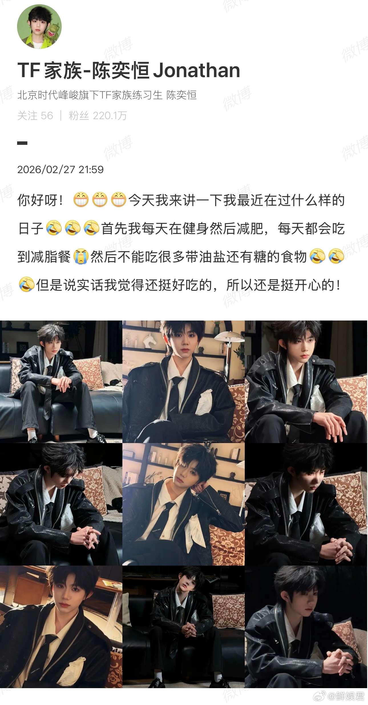 陈奕恒发文说每天在健身减肥吃减脂餐,自律又努力啊!一边严格管理身材,一边用心演绎林清源学长!舞台亮眼演戏认真,这样踏实又上进的陈奕恒谁能不爱!陈奕恒在健身减肥