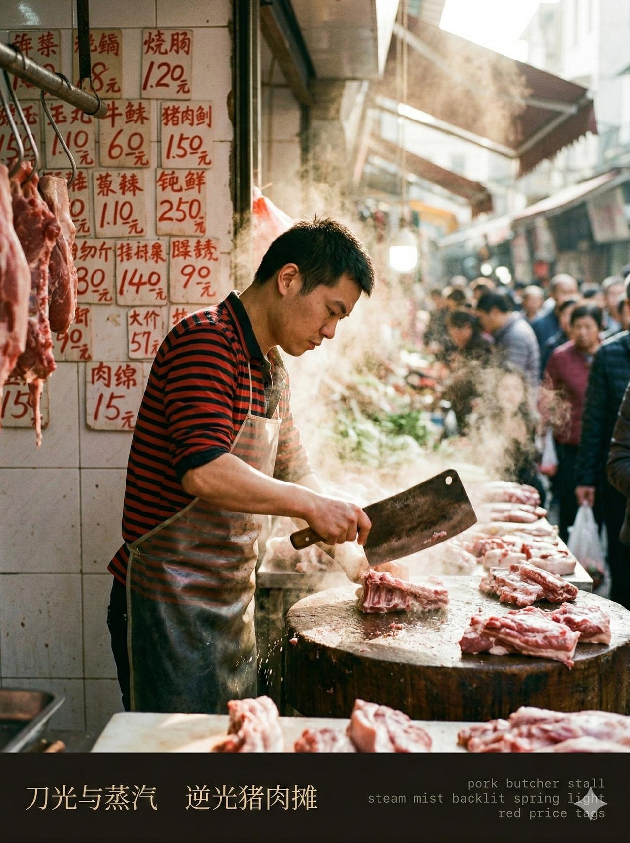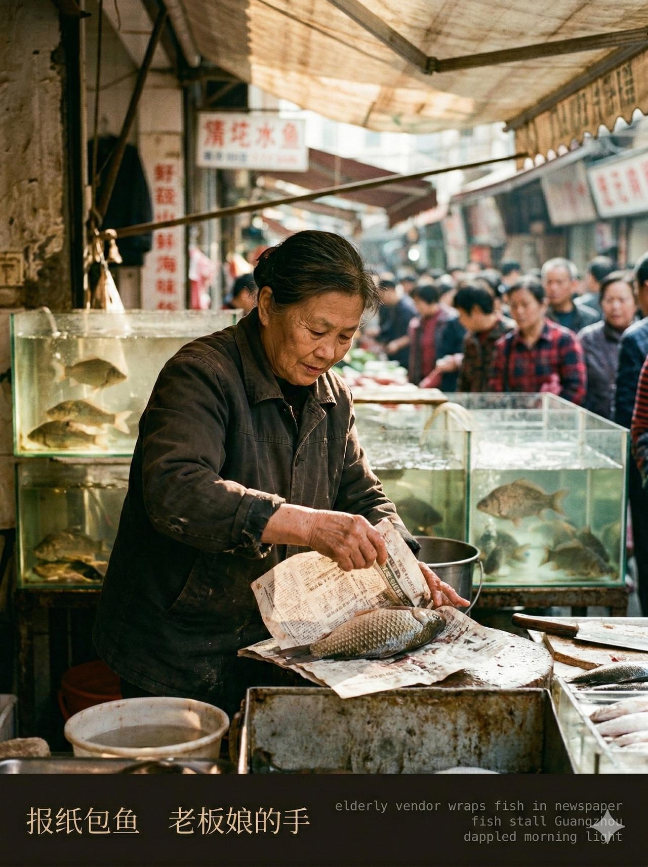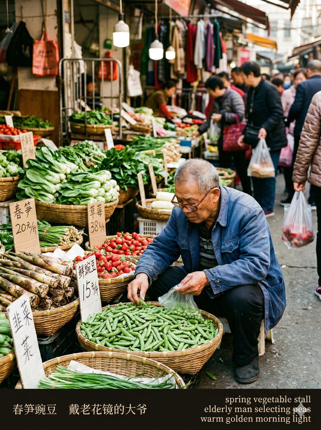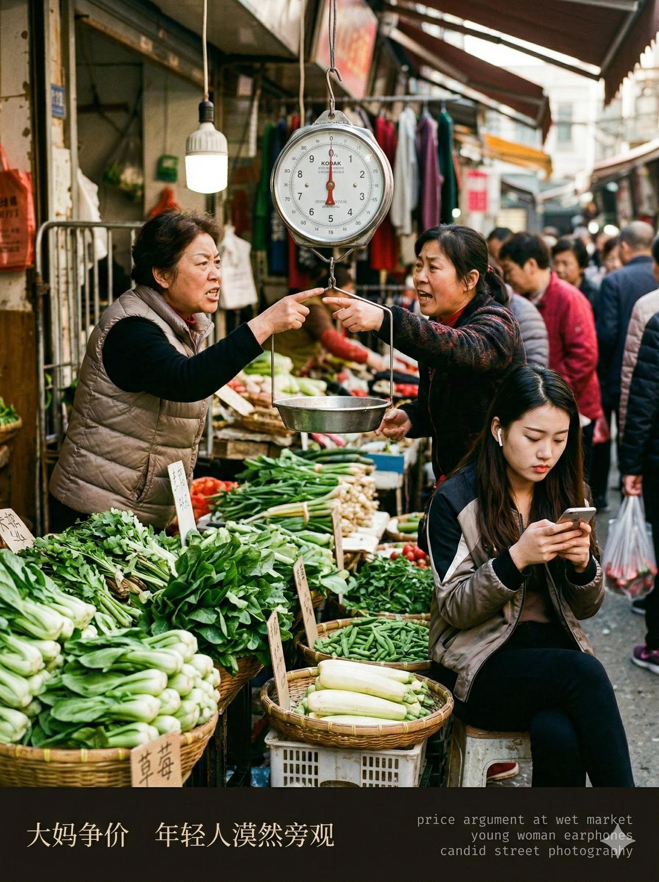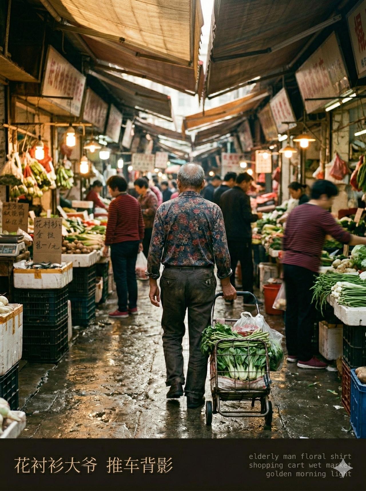 用 AI 生成了一组早上在菜市场转悠的照片。 大爷蹲在那儿挑豌豆,挑得比谁都认真;旁边两个人吵着价,小姑娘全程刷手机,头都没抬一下。猪肉摊逆着光,卖鱼阿姨的手不知道捞过多少条鱼了。 花衬衫大爷推着车往前走,背影挺精神的。最后一张是个小孩低着头坐在旁边玩手机,白球鞋上溅了点泥,也不管。 吵吵嚷嚷,熙熙攘攘,每个人都在认真过日子,挺好的。
