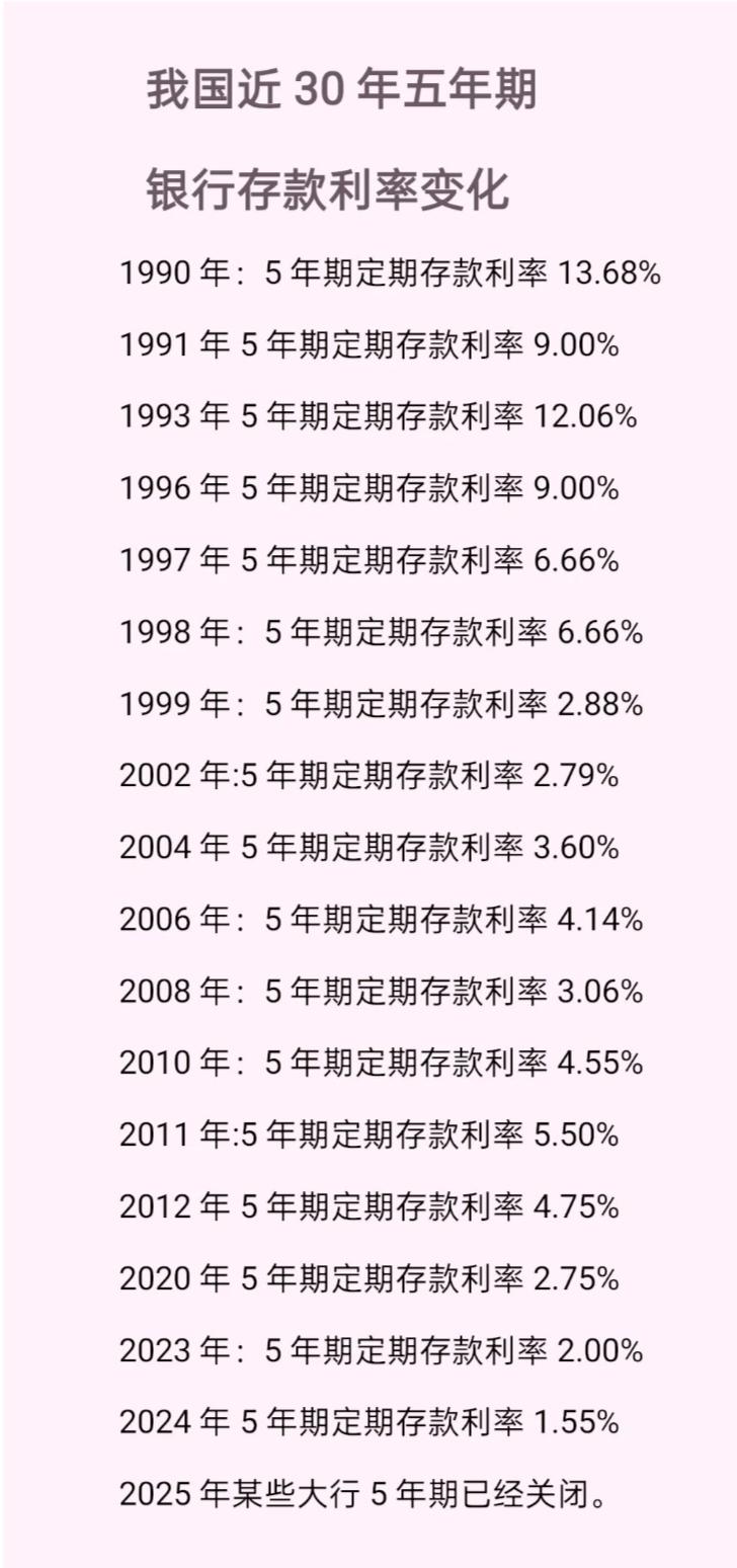 银行30年5年定期存款利率变化 从1990年的利率13.68%到2024年的利率1.55%这二十几年银行利息一直在下跌。利息越来越低。存款利率下降 利率 2025年甚至有些银行已经把5年定期存款关闭了。现在已经来到了0利率时代了!家庭资产要进行多元配置!