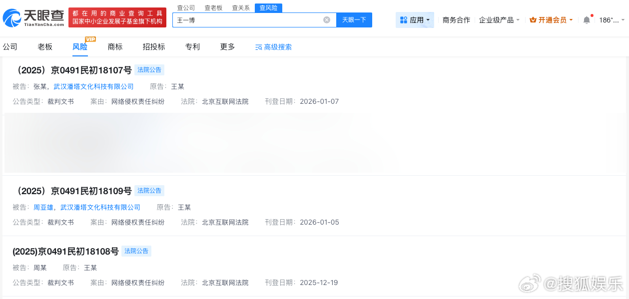 天眼查法律诉讼信息显示,近期,王一博已多次发起网络侵权责任纠纷,被告涉及多个自然人及公司。其中,周某被法院公告送达民事判决书,法院判决被告周某在其涉案小红书账号赔礼道歉,并赔偿王一博经济损失2万元。此外,黄某被判向王一博公开道歉,赔偿经济损失(含维权合理支出)5万元。