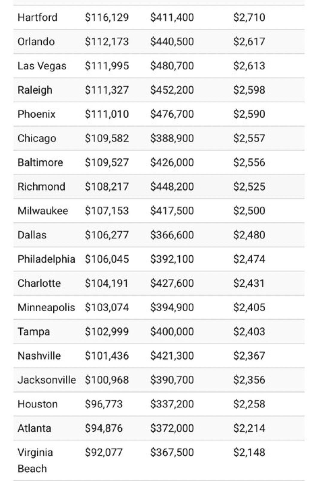2026年美国买房价中位数房屋需要年薪$106,731,买房需要年薪最高的十个城市: 1.圣何塞$458,504, 2.旧金山$321,463, 3.圣地亚哥$235,343, 4.洛杉矶$224,190, 5.纽约市$200,280, 6.波士顿$190,858, 7.西雅图$188,158, 8.华盛顿特区$161,522, 9.迈阿密$156,982, 10.丹佛$154,131。