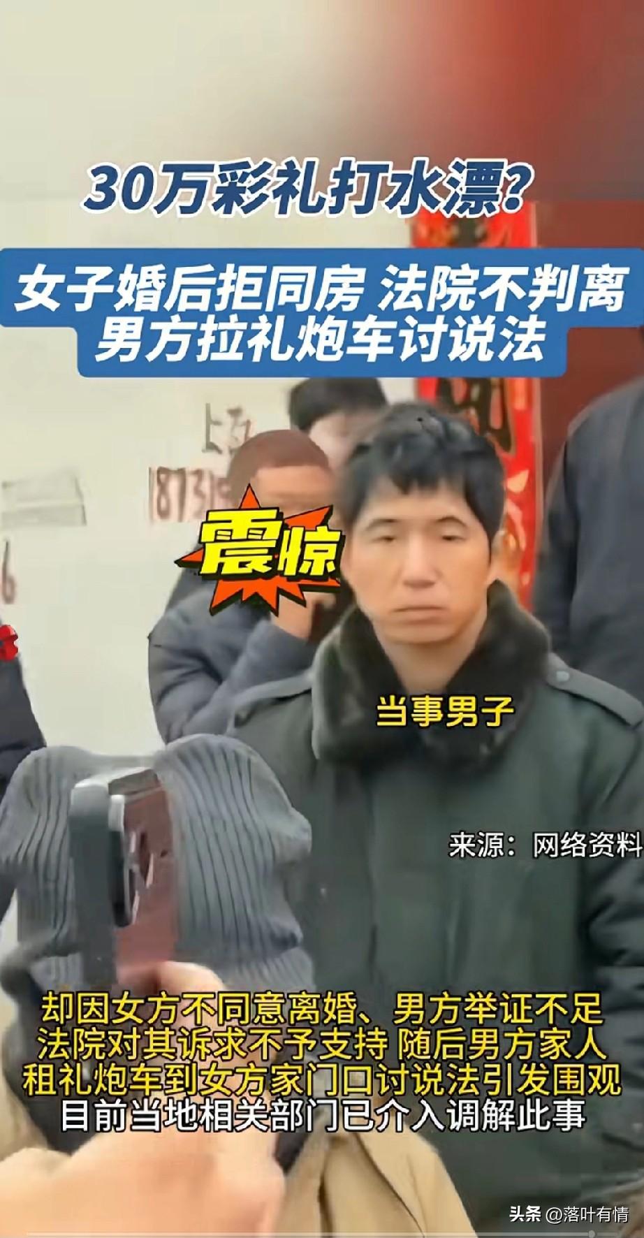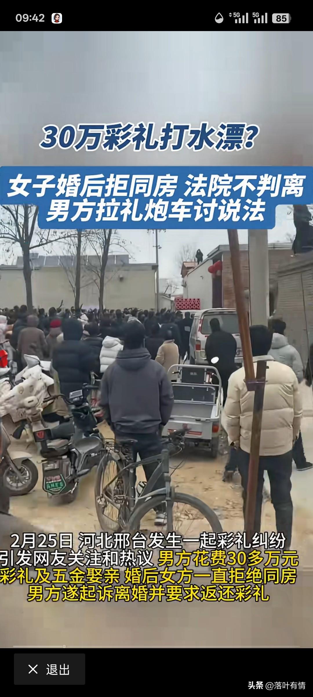 近日河北邢台彩礼纠纷闹上热搜, 还引起了网友的关注和热, 男子花费30万元彩礼及五金娶妻, 婚后女方一直拒绝洞房, 于是男子起诉离婚, 要求退还彩礼及五金, 结果女方不同意离婚, 法院也驳回了河北男方的请求, 以为这样就可以结束矛盾, 殊不知更大的矛盾就此爆发, 男方和他的姐姐年后直接租了一辆炮车,直接上门开始讨说法, 这吸引了附近的所有村民, 男方的姐姐站在车上, 开始被附近的村民诉说弟弟的委屈, 30万彩礼娶到媳妇儿, 晚上不让同房, 睡觉连衣服都不脱, 就连内衣都不带换的, 就是为了防住自己的老公, 这样的媳妇儿要这有啥用? 关键还不同意离婚, 还真是离了大谱了, 还想讹掉30万的彩礼以及五金, 这怎么说都说不过去, 即便男方因为证据不足, 无法打赢离婚官司, 但是这样的婚姻又有什么意义? 不知道女方为什么坚持不退彩礼和五金,就想这样拖着男的, 什么样的子女就有什么样的父母, 一点也没有说错, 女儿不懂事的话难道父母也不懂事? 为啥不给人家退彩礼? 简直不讲道理, 这就怨不得人家上门大闹了, 毕竟30万的彩礼以及五金不是小数目, 这可是普通人家,一辈子的积蓄! 大家觉得花30万彩礼不让同房这事有理吗? 河北身边事 离婚算是一件丢脸的事情么