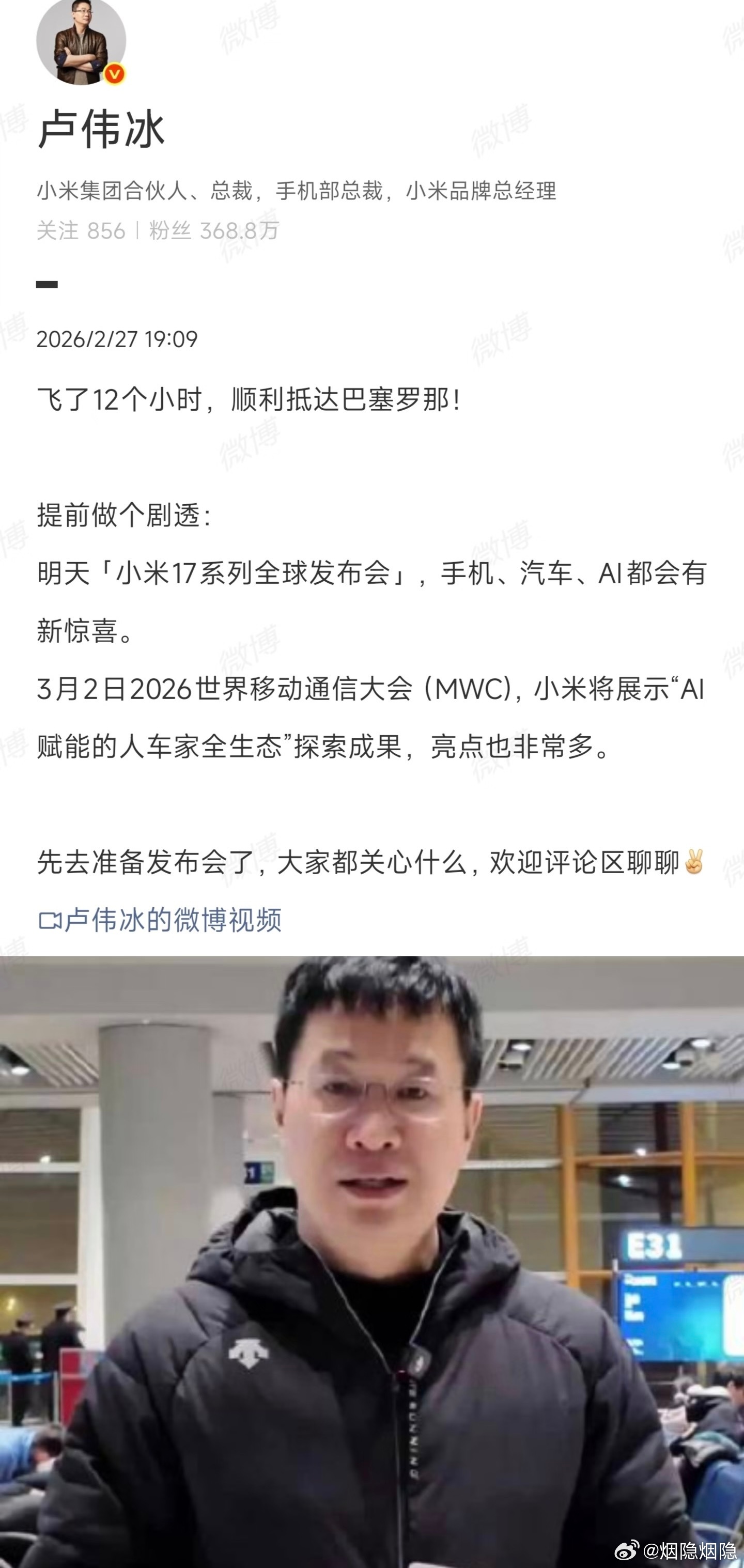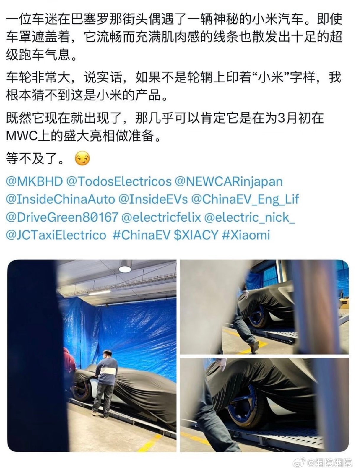 小米超跑来了,这个尾灯怎么样昨天,海外网友爆料,在西班牙巴塞罗那街头拍到了小米未发布的全新汽车,从露出的轮毂罩看到印了“xiaomi”字样。虽然被篷布盖着,但一眼可辨是一台超级跑车。在这个时间点出现在巴塞罗那,是为了即将开幕的MWC 2026准备的。这款车可能是此前小米 SU7 Ultra 在和《GT 赛车 7》联动时,提到的小米 Vision Gran Turismo 概念车。今天,小米官方发布微博:“给大家准备了一个惊喜。Coming soon...”随后,雷军转发了这一条消息,表示明天也就是3月1日会有新品等待大家。