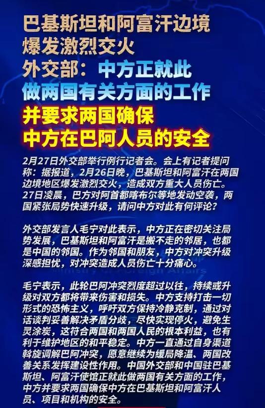 《阿富汗时报》昨晚(2月27日)报道,阿富汗塔利班已向中东等国家发出呼吁,请求他们帮助调解与巴基斯坦之间的停火以结束冲突。看来阿塔被巴基斯坦打怕了,刚打了一天就开始求和,但是巴基斯坦拒绝停火,其总理称,“我们的军队将彻底粉碎入侵者”;中东国家也未对此作出回应,因为巴方发动打击的理由就是打击恐怖主义组织。这次阿塔挨揍并不冤,巴方已多次警告阿塔勿给恐怖主义提供保护伞,但阿塔执意妄为;此外,中方一直在为双方劝和促谈,阿塔舍近求远却是为何?