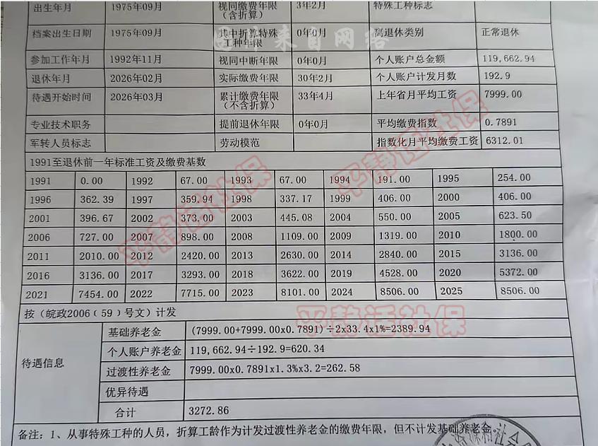 晚退休两个月能多多少钱? 刚好看到一个安徽的案例,由于年龄问题弄错了,所以有两份核定表,刚好说明了这个事。但这位女士是幸运的,因为她是安徽退。 退休地安徽合肥,1975年9月生人,第一次2025年12月退,见第一个图。缴费33年2个月,个人账户118004.42元,指数0.7754,养老金核定为3224.36元。 第二次2026年2月退,见第二个图。缴费33年4个月,个人账户119662.94元,指数0.7891,养老金核定为3272.86元。 差了两个月,养老金增加了48.5元。 换别人能增加这么多吗?不一定! 她沾光在哪了? 1、跨年。第一次是在2025年退,指数只计算到24年12月底,2025年的不计算。但第二次是2026年退,指数只计算到25年12月底,2025年的指数较高,帮着把平均指数提高了0.7891-0.7754=0.0137,这是最关键的地方。基础养老金、过渡性养老金都影响。 2、缴费年限增加、计发月数减少,基础养老金同时增加。 假如延长了,但没有跨年,是绝对增加不到48.5的,一般每增加一个月多10-20元之间。 不信你就算算。
