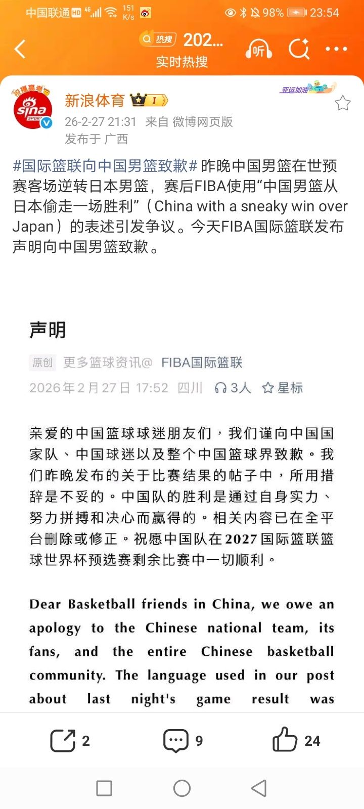 2026年2月28日-2027国际男篮世界杯亚大区预选赛第一阶段第4轮 伊拉克70-78被叙利亚逆转/伊朗60-73约旦/黎巴嫩94-64大胜沙特/卡塔尔99-73大胜印度 部分重点赛事预告:CCTV5直播: CCTV5+直播:19:00 2025-2026女排超级联赛A级季后赛第2轮(第16轮) 上海-天津 CCTV5客户端直播:15:30/19:00(3场) 2025-2026女排超级联赛A级季后赛第2轮(第16轮) 北京-河南/浙江-福建/江苏-山东 其他: