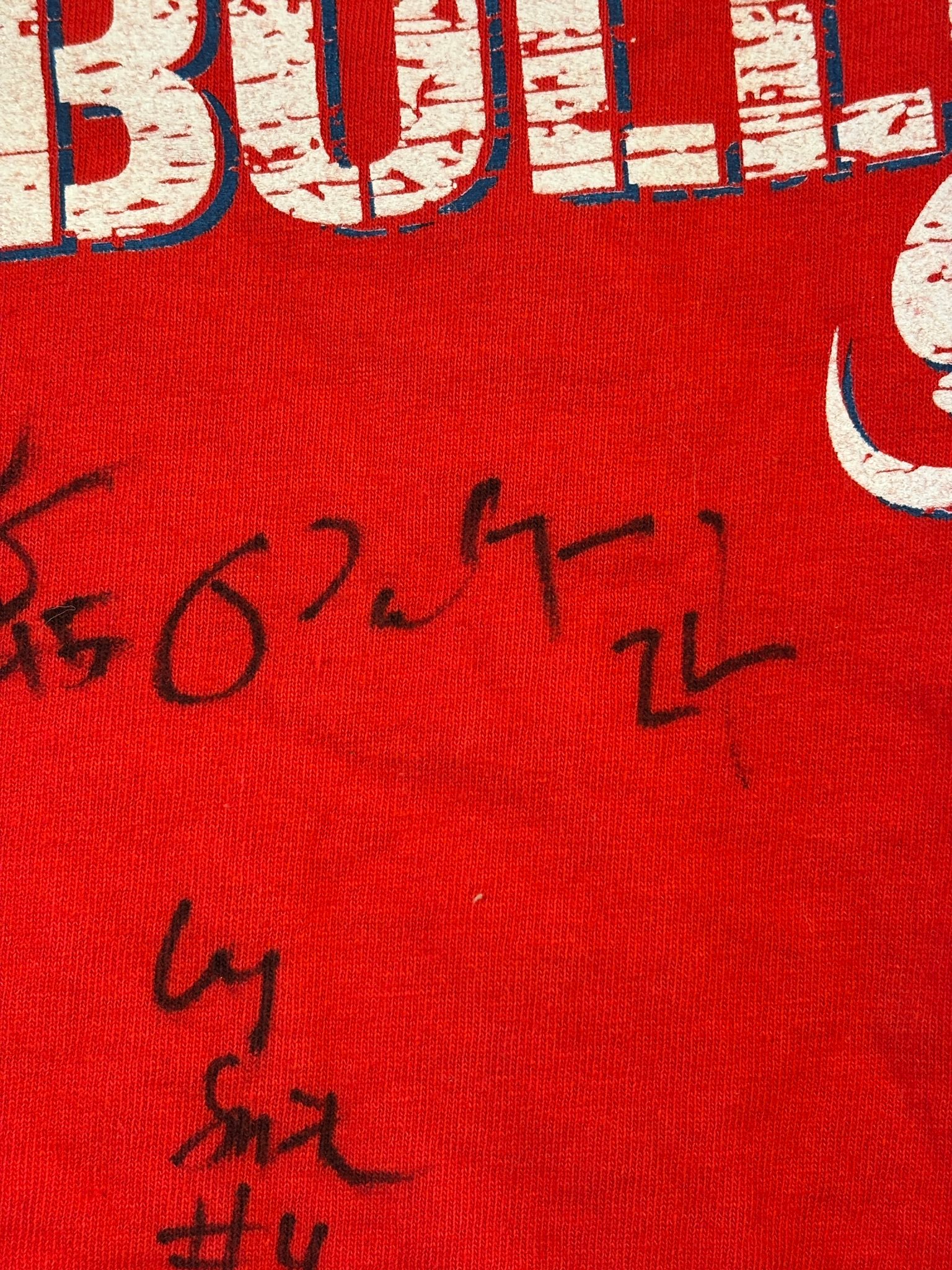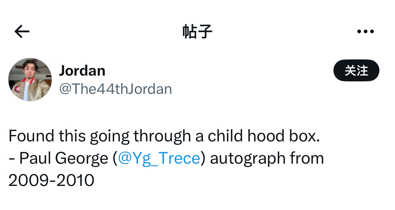 珍藏级签名!国外一球迷在社交媒体上晒出当年的一件弗雷斯诺大学篮球队的T恤,并配文:“整理童年物品时发现了这个 - 保罗·乔治2009-2010年(大学时期)的签名!”