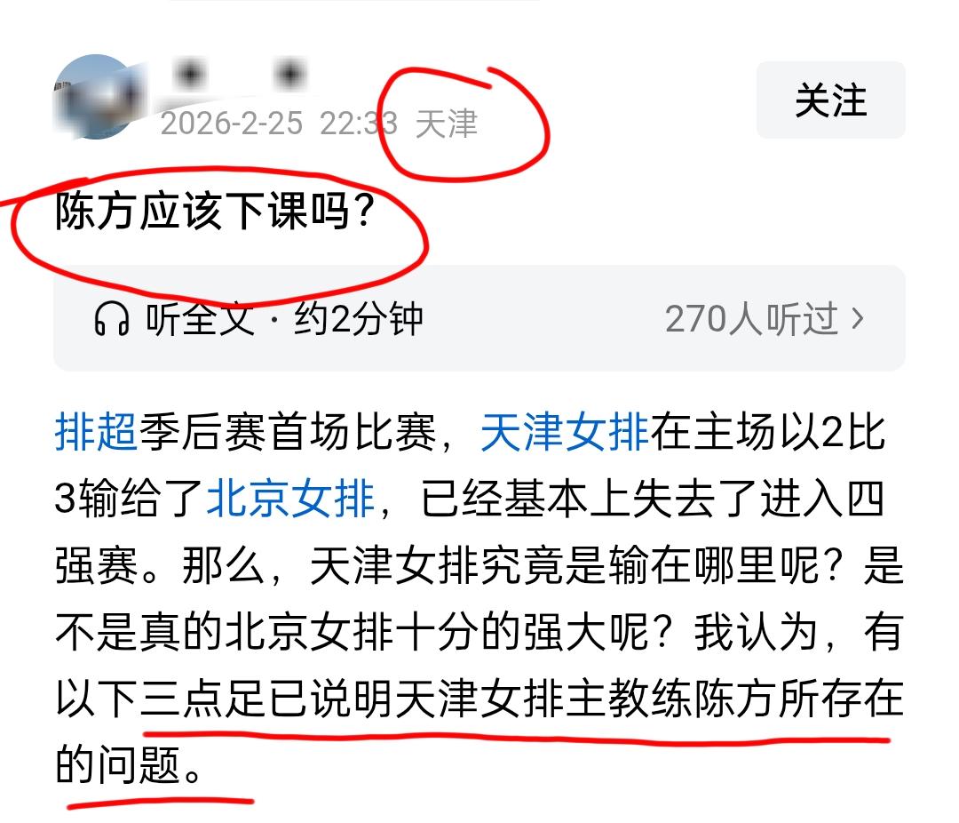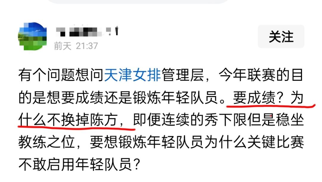 陈方该不该下课?陈方巧妇难为无米之炊引爆帅位危机 2025-2026赛季排超联赛季后赛首轮,天津女排主场2:3不敌北京女排。这场比赛主教练陈方不信任年轻队员坚持用老队员,决胜局在8:6领先交换场区,竟然10:15被北京女排逆转。 赛后天津球迷情绪强烈,大量言论直指陈方执教短板:临场应变差、轮换死板、贻误战机,认为他不配执掌天津女排这支传统强队,主场响起“下课”声,社交平台上“陈方下课”成为热议话题,球迷普遍认为继续执教不利于球队争冠与新人培养。 笔者倒是认为,陈方不应该下课。如今的天津女排走到这一步并非陈方的错。之前王宝泉担任天津女排的主教练吃尽了主教练陈友泉留下的老本,在上一届联赛中李盈莹、王媛媛主打仍然打6场输4场不得已黯然交棒。陈方接棒之后急于出成绩,死薅队员羊毛,造成伤员满营。事实上,无论谁来接棒担任天津女排的主教练,拿到的成绩应该是相同的,毕竟巧妇难为无米之炊。因此,天津球迷应该支持天津体育部门强化青训培养接替人才,放弃买黑人、放弃在全国范围内掐尖的急功近利做法,而不是叫嚣陈方下课。 球迷朋友们,对于陈方的表现以及天津女排的生态,你们认为陈方应该下课吗?欢迎评论区各抒己见。 北京