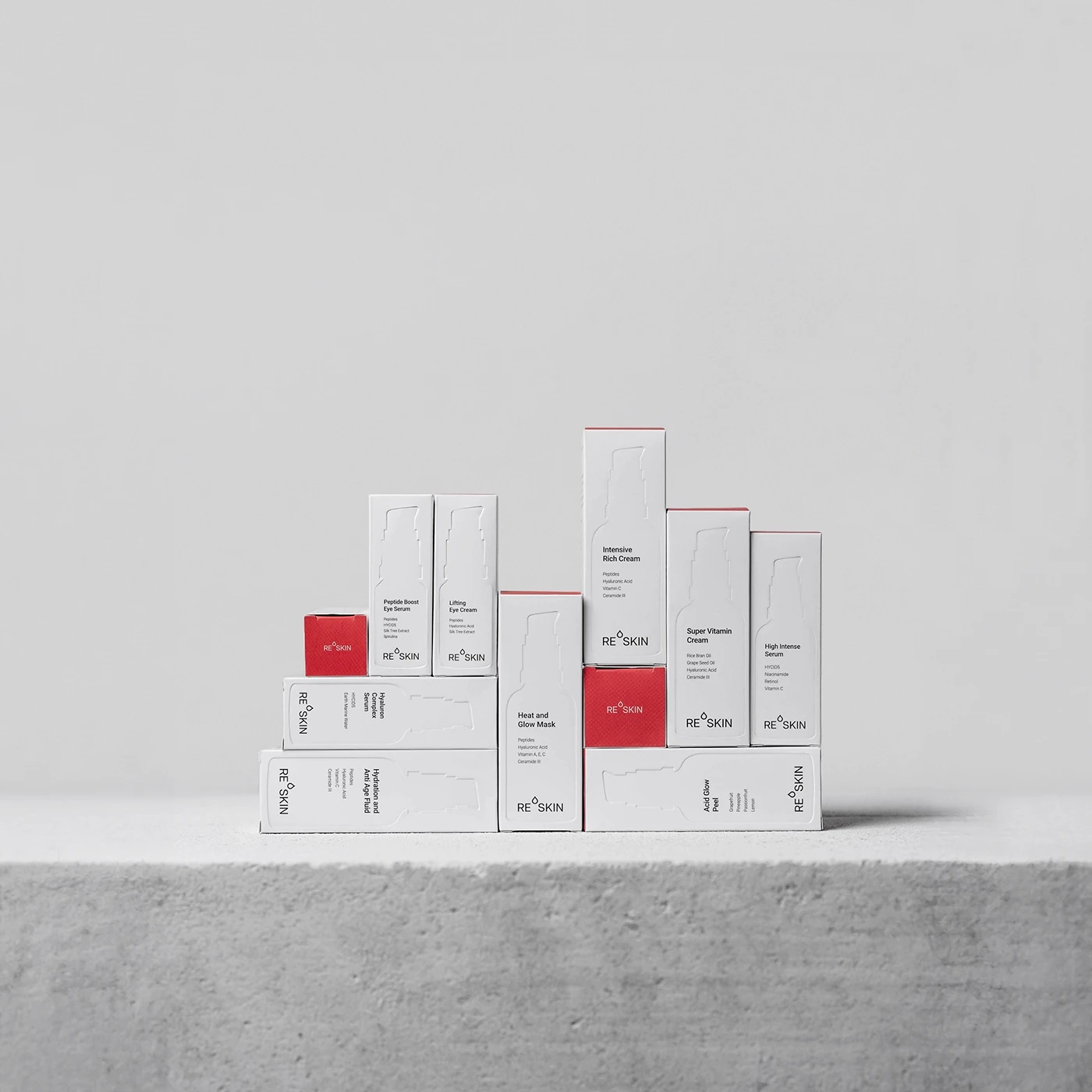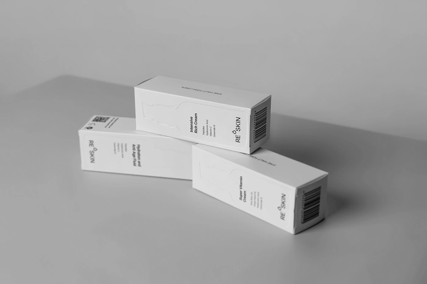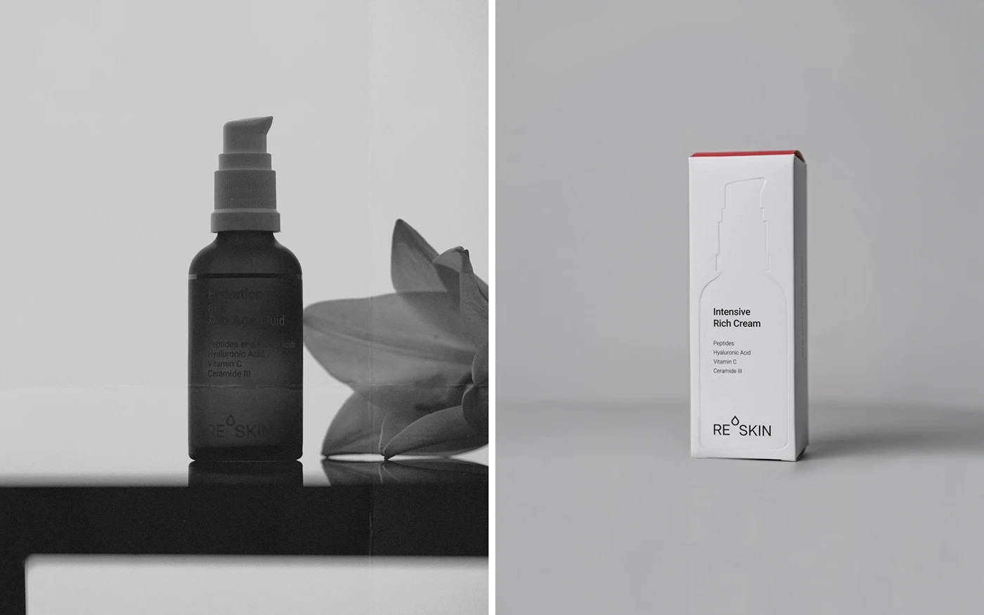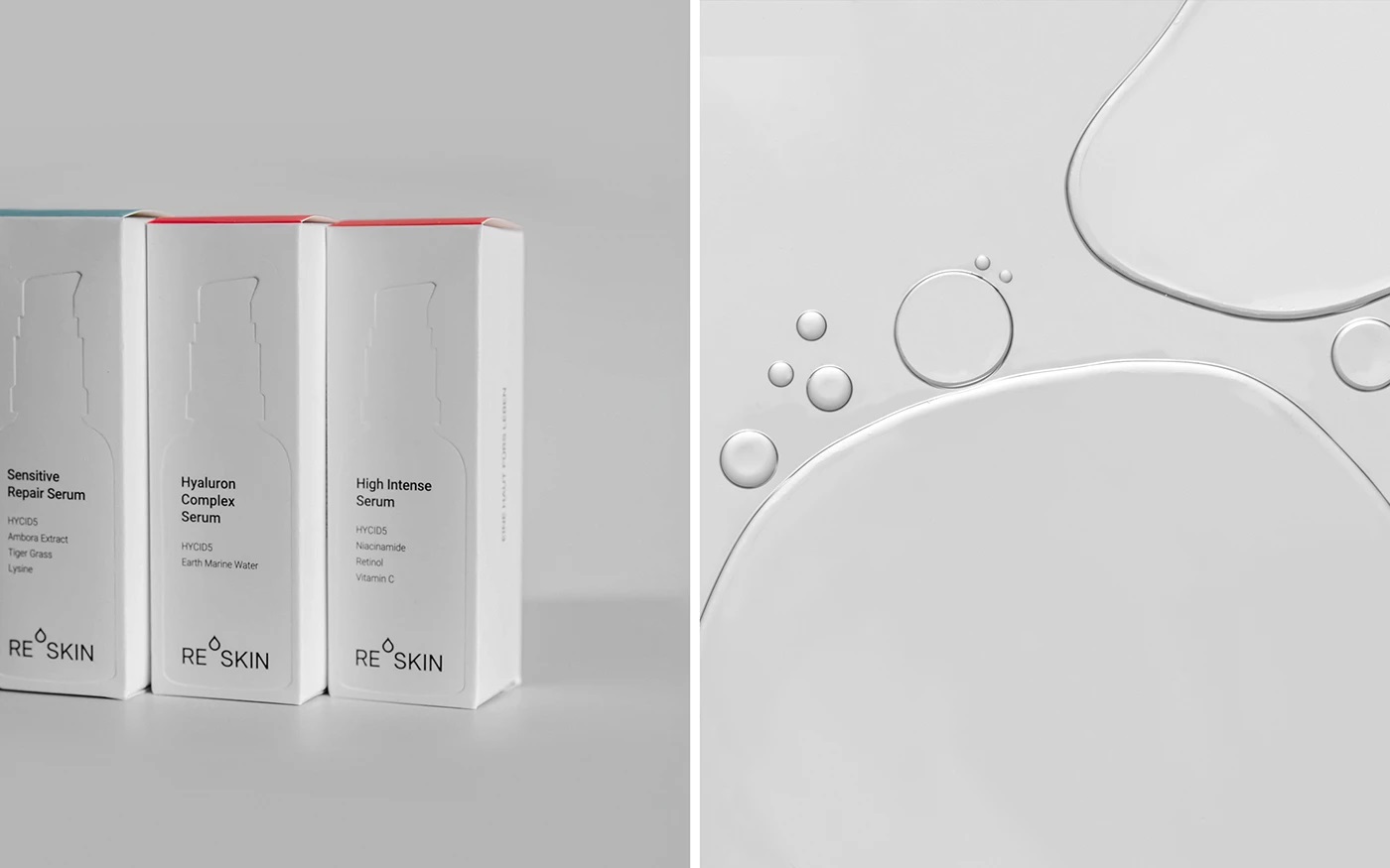 ReSkin Cosmetics 采用简约高端包装设计,以全白底色搭配顶部红色(适合所有肤质)与绿色(适合敏感肌)区分产品线。盒子正面凸印产品轮廓,信息位置严格匹配瓶身,强化透明度与品牌连贯性。选用高质量厚纸结合凸印工艺,在预算内实现触感与视觉的高端体验,体现可持续、清洁护肤理念。